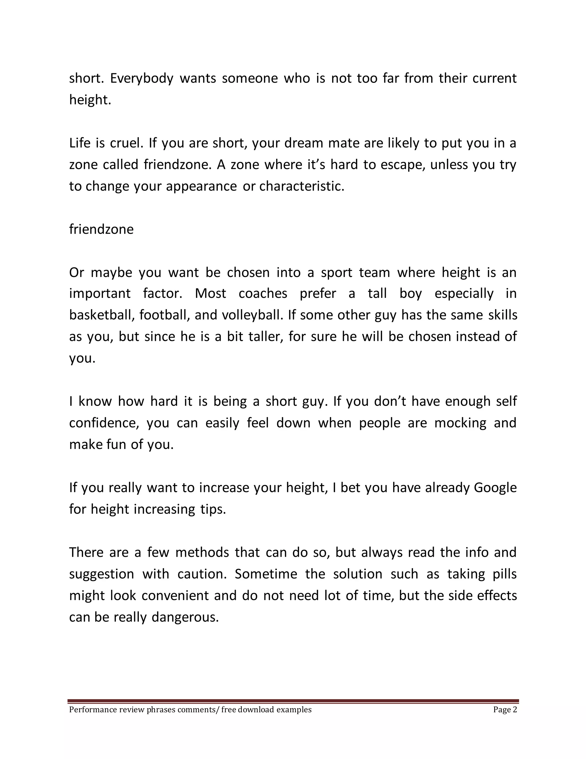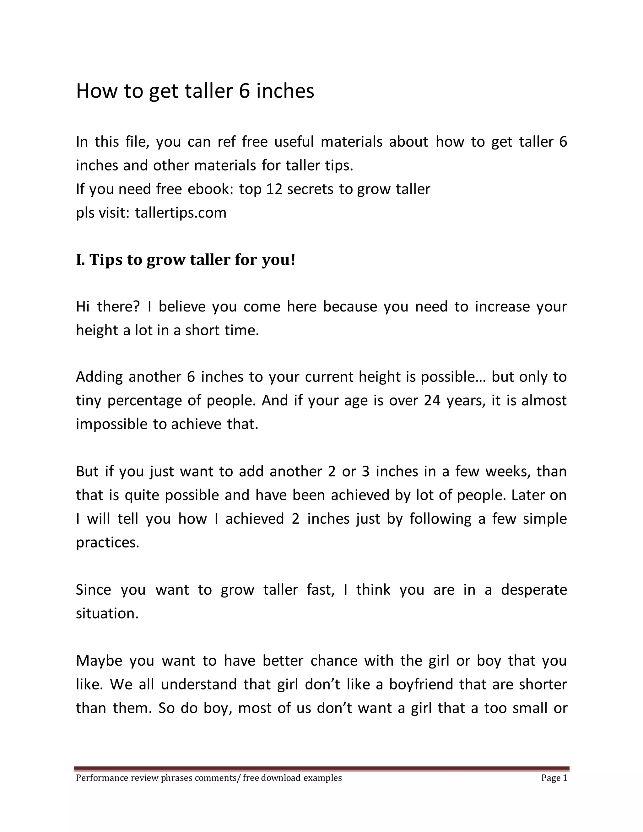 This document provides tips and information on how to potentially increase one's height. It suggests that adding 6 inches to one's height is very difficult after age 24, but gaining 2-3 inches is possible through stretches, exercises, diet, sleep, and avoiding stunting factors. The document recommends a balanced diet with protein, calcium, vitamins D and zinc, daily exercise including jumping, sports, and walking, getting adequate sleep, and understanding that genetics are a main determinant of height.