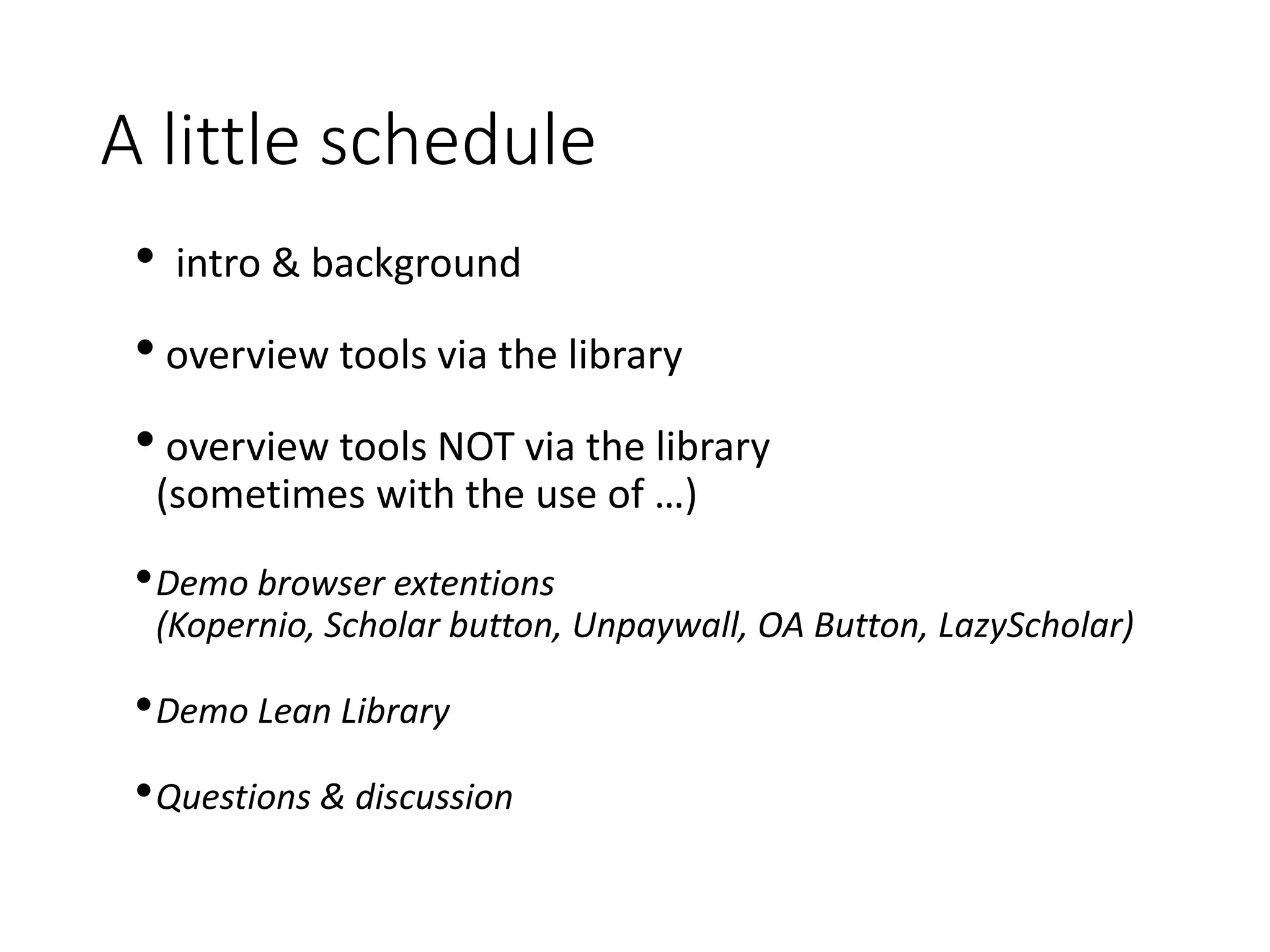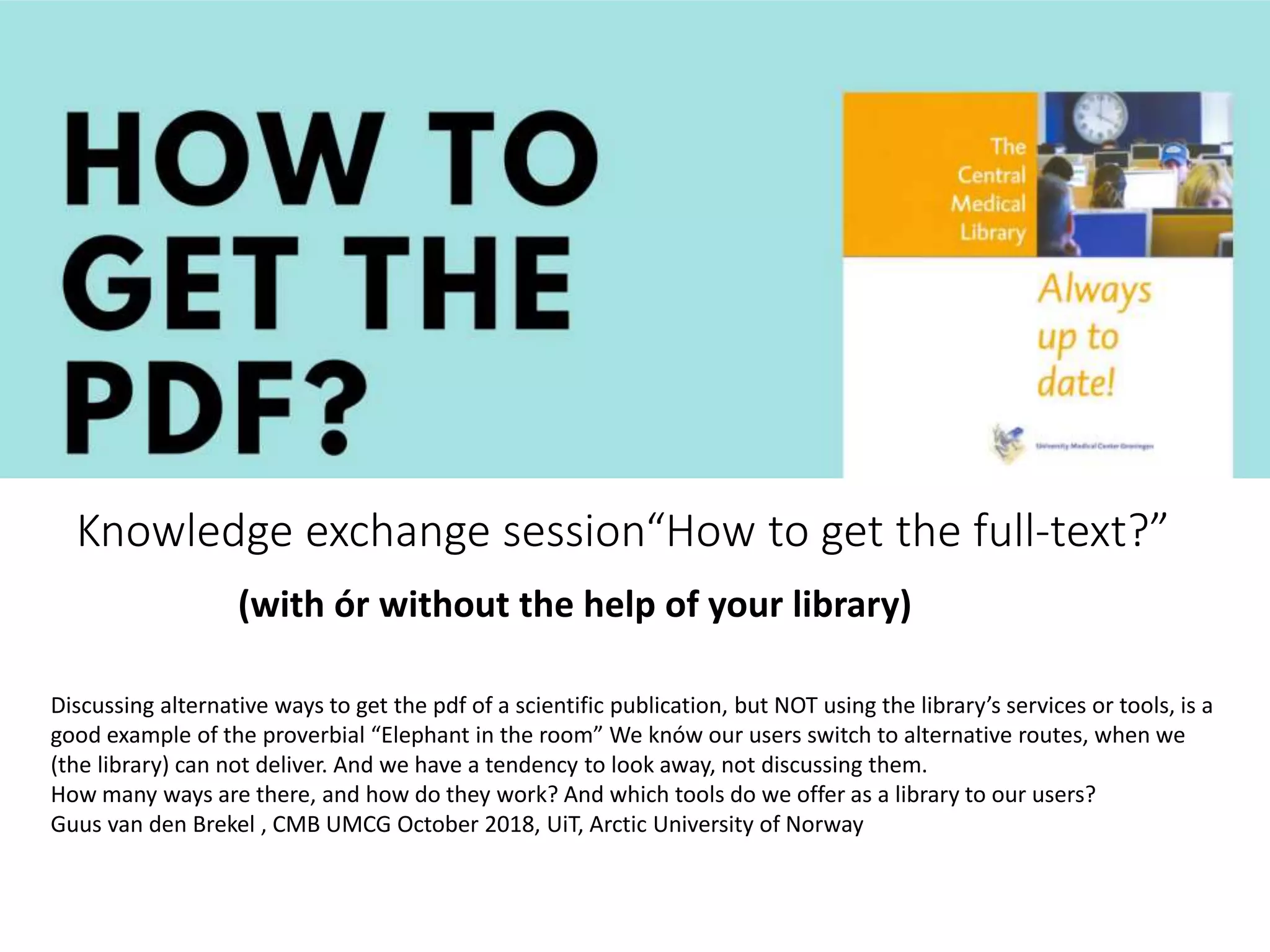 The document discusses a knowledge exchange session focused on alternative methods for accessing full-text scientific publications without relying on library services. It provides an overview of library tools, freely available resources, and browser extensions like Kopernio and Unpaywall that facilitate access. The session aims to inform users and library staff about these alternatives while exploring potential improvements in library services.