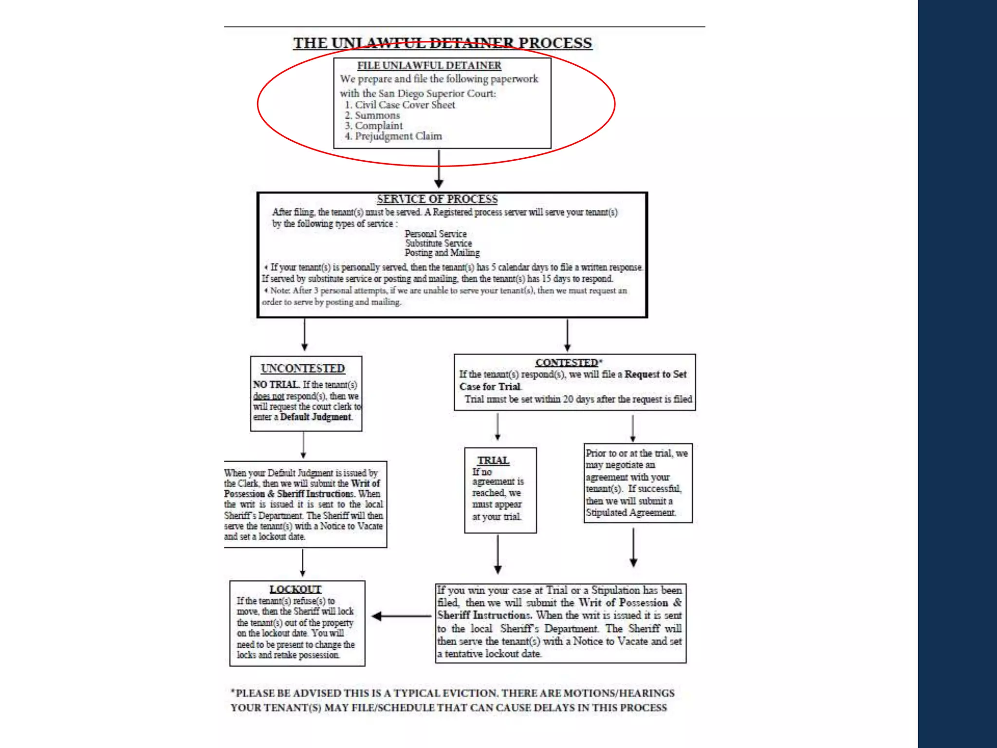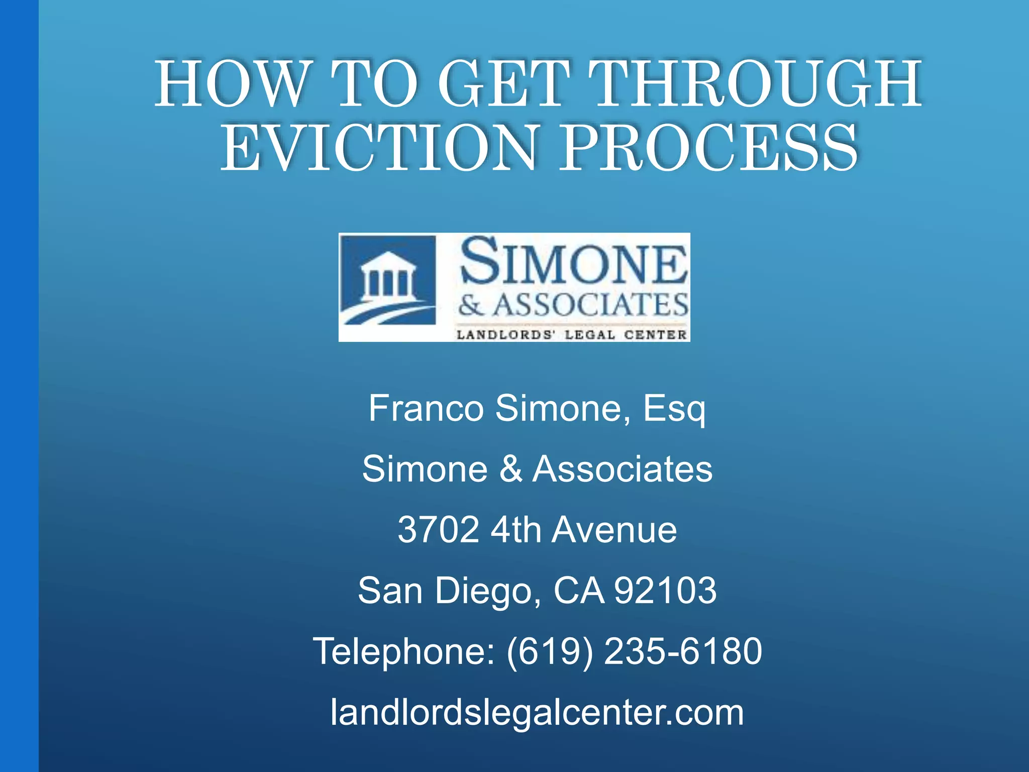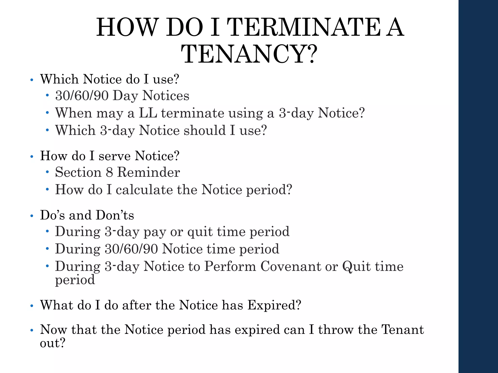 This document provides guidance on evicting tenants through the eviction process. It discusses which types of eviction notices landlords can use, such as 30-day, 60-day or 3-day notices. It also covers how to properly serve notices, calculate notice periods, and what landlords can and cannot do after a notice expires. The document concludes by explaining the unlawful detainer court eviction process, including filing documents, serving tenants, requesting defaults or trials, obtaining judgments, lockouts and collecting debts. The overall document serves as a step-by-step guide for landlords on navigating the legal eviction process.