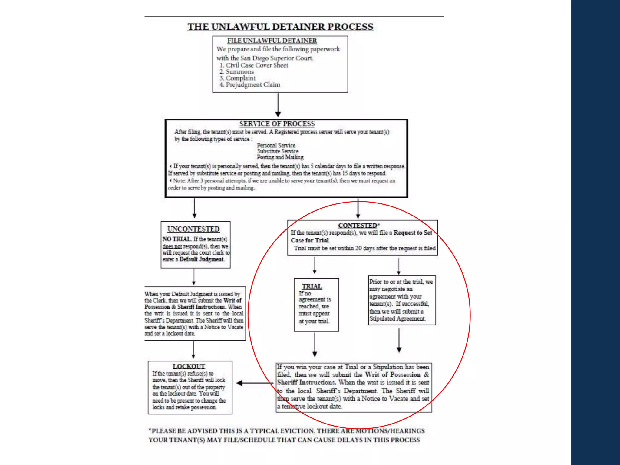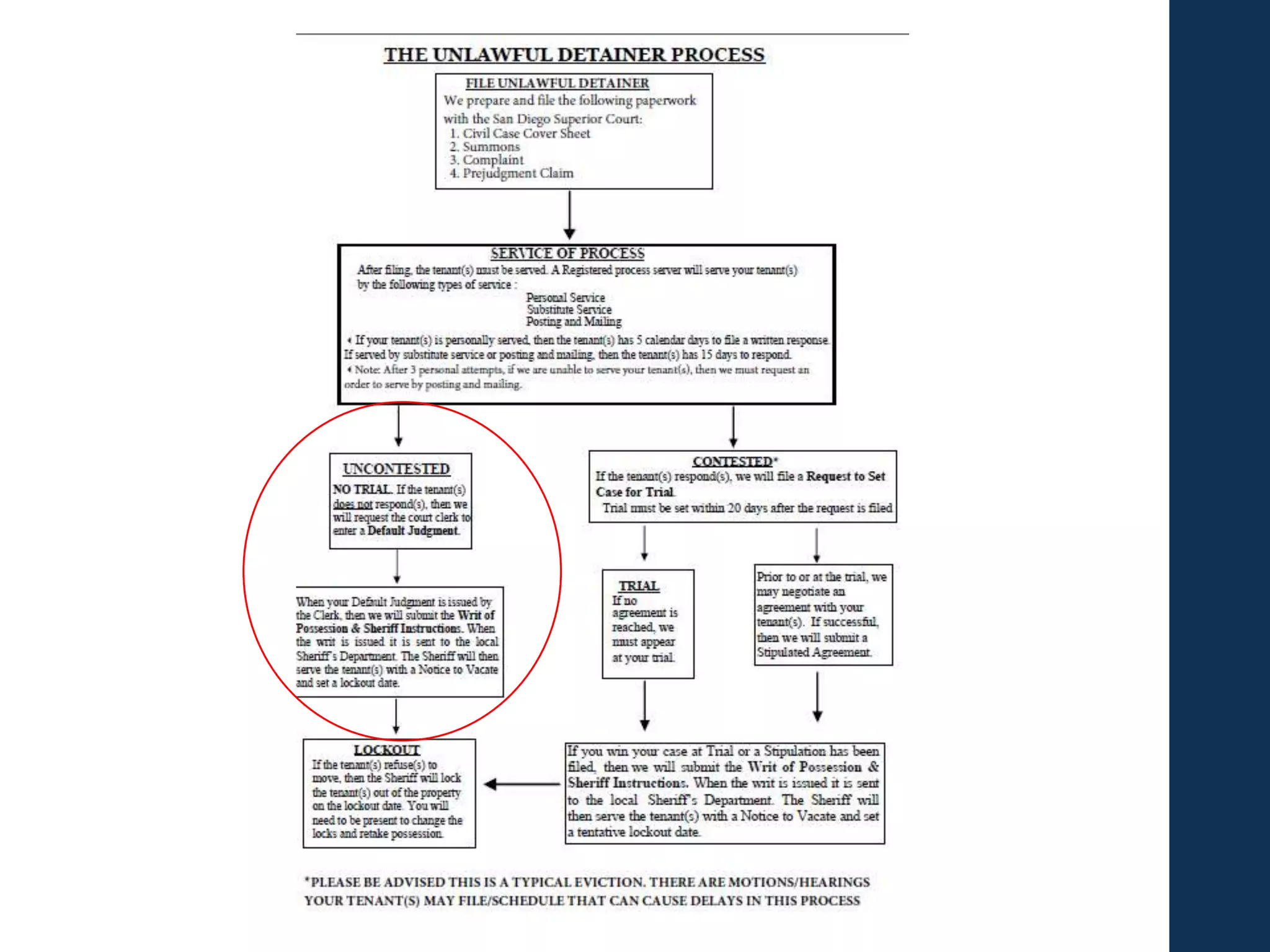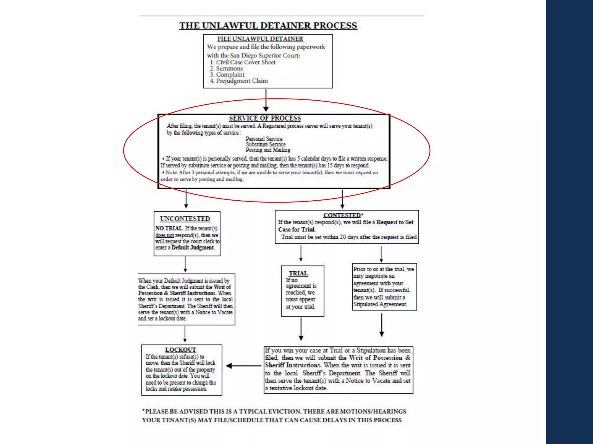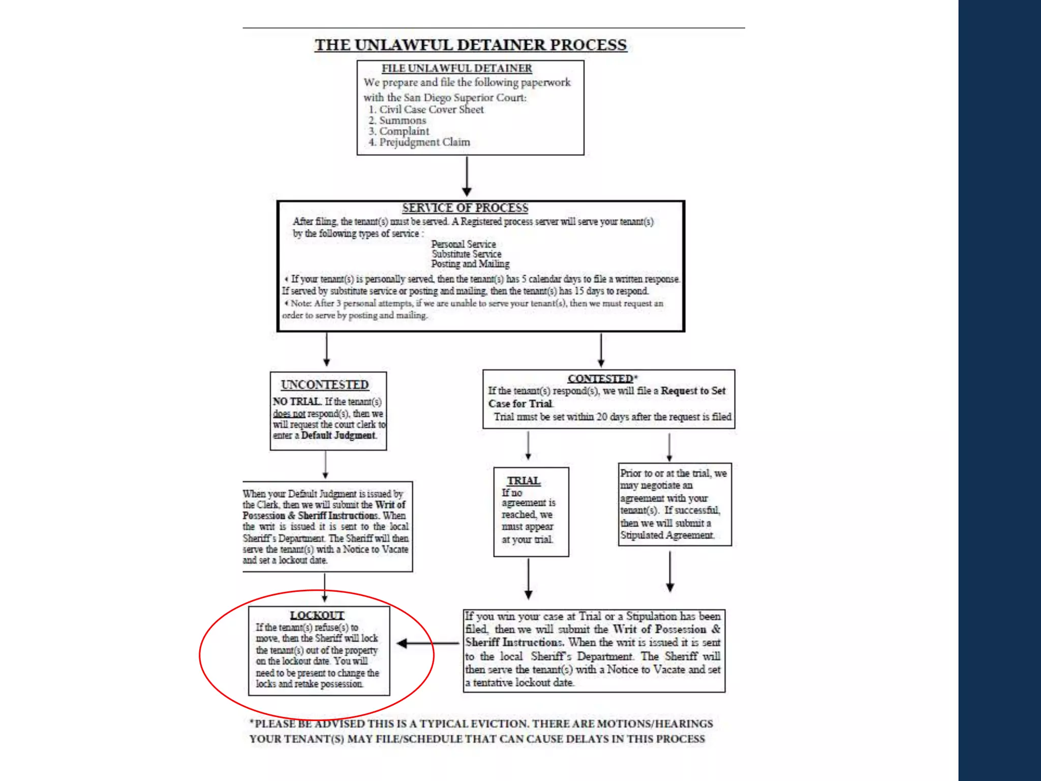 This document provides guidance on evicting tenants through the eviction process. It discusses which types of eviction notices landlords can use, such as 30-day, 60-day or 3-day notices. It also covers how to properly serve notices, calculate notice periods, and what landlords can and cannot do after a notice expires. The document concludes by explaining the unlawful detainer court eviction process, including filing documents, serving tenants, requesting defaults or trials, obtaining judgments, lockouts and collecting debts. The overall document serves as a step-by-step guide for landlords on navigating the legal eviction process.