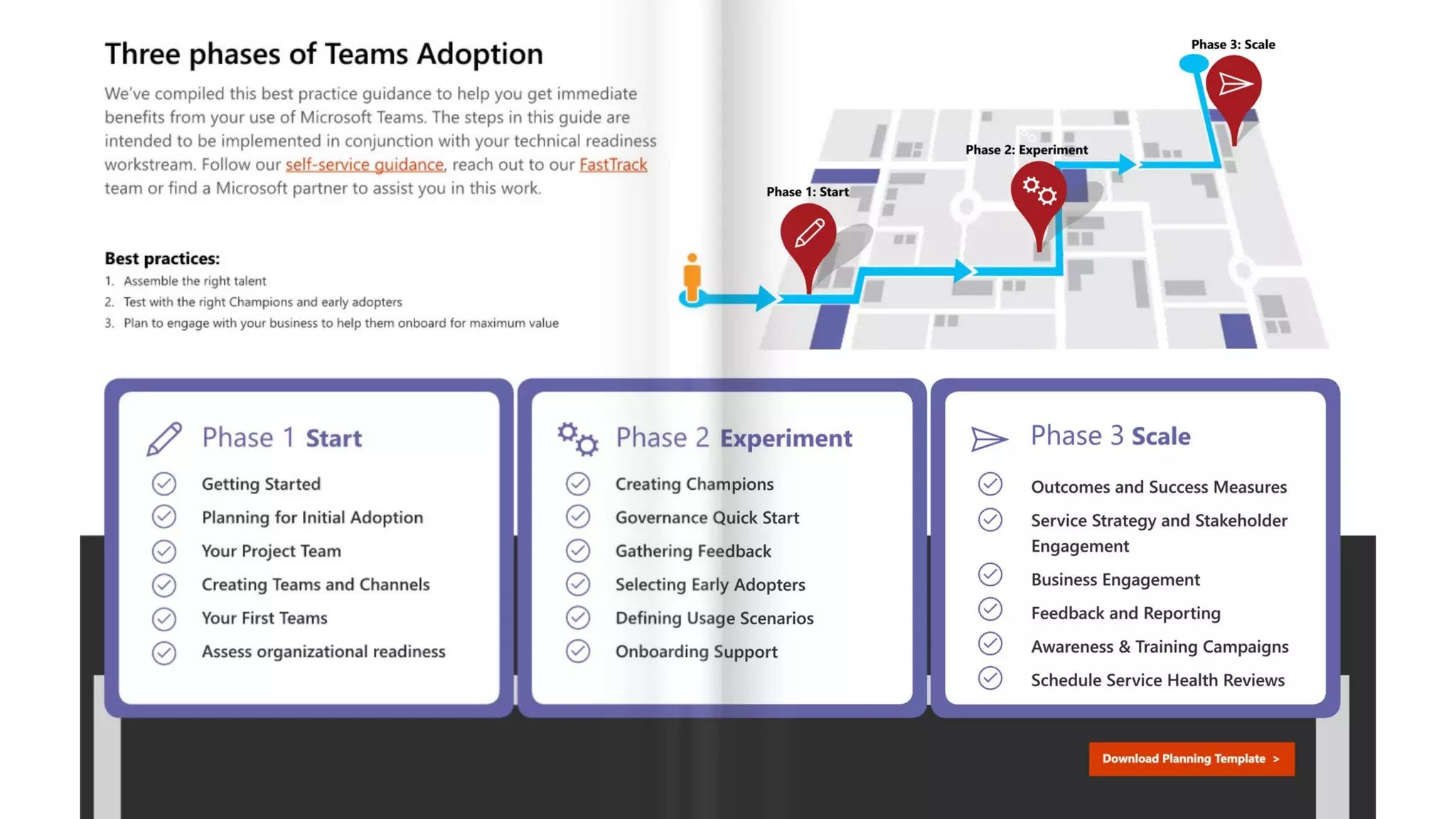 The document outlines a case for change regarding the adoption of Microsoft Teams, emphasizing the need for sustainable behavior change in collaboration. It details six effective adoption strategies, which include establishing a framework, ensuring operational governance, demonstrating quick wins, and delivering continuous learning. Resources and examples to support these strategies are also provided, aiming to enhance user experience and business outcomes.