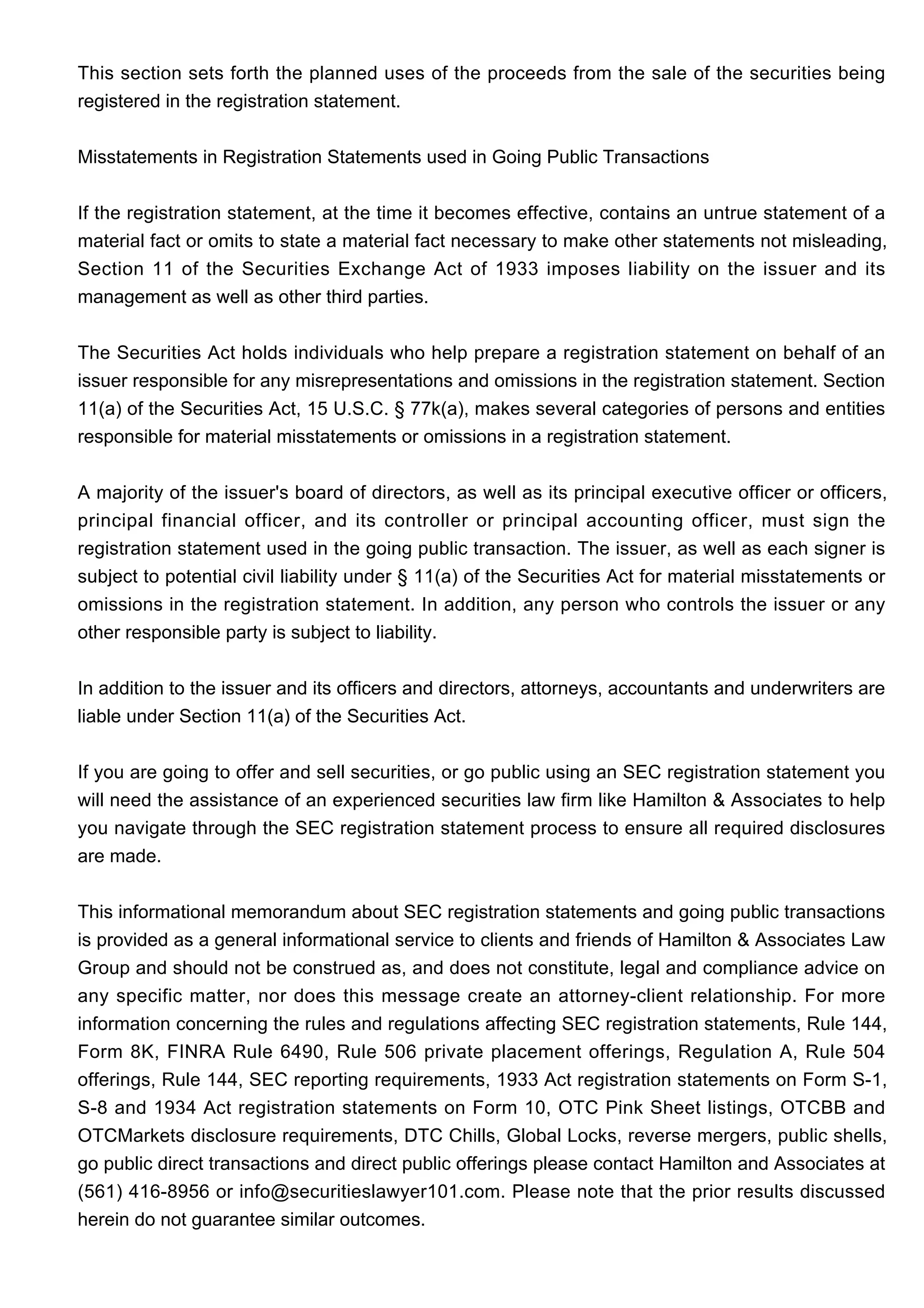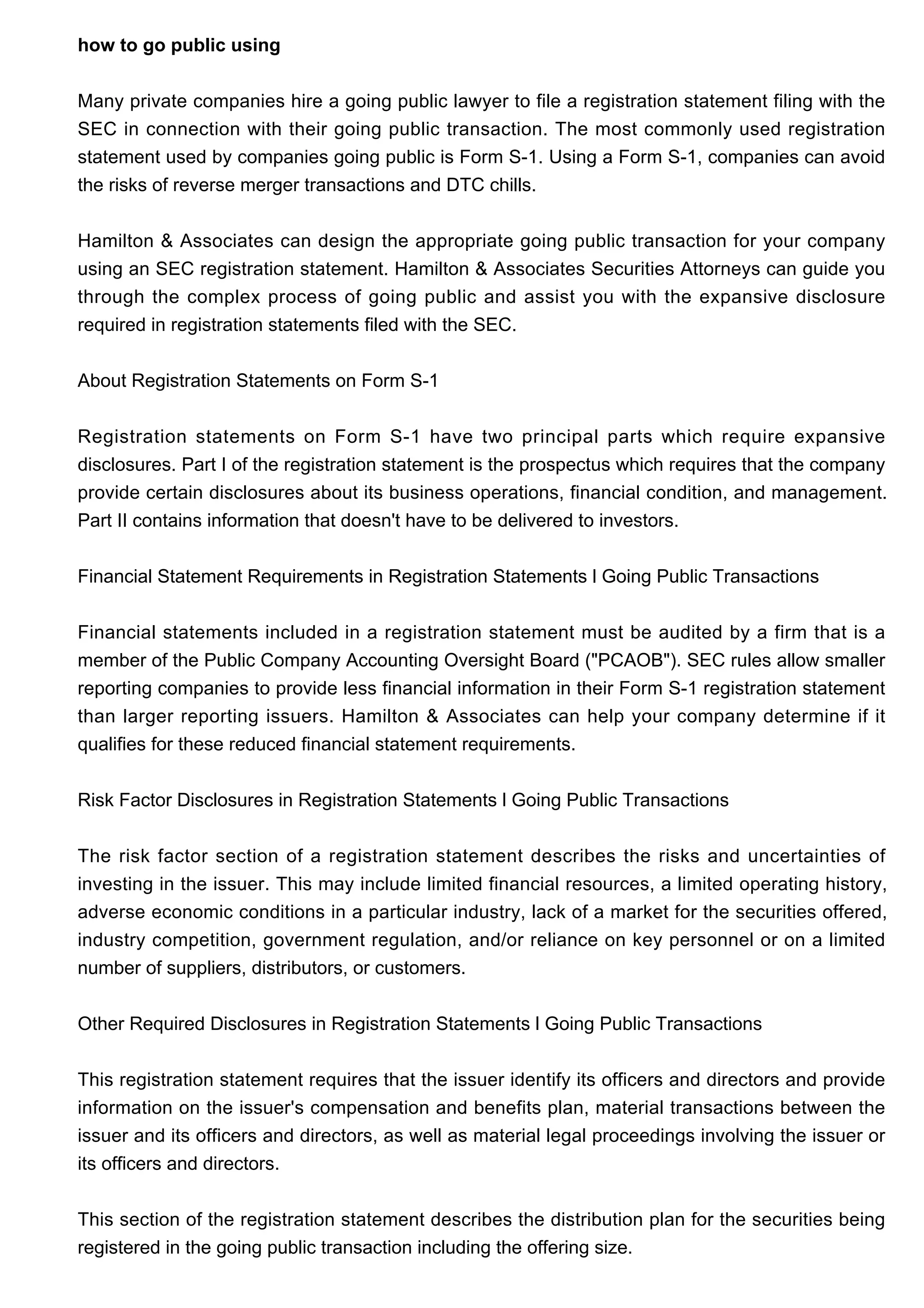 This document discusses how private companies can go public by filing a registration statement, typically a Form S-1, with the SEC. It describes the key parts of the Form S-1 including audited financial statements, risk factors, information about officers and directors, and the intended use of proceeds. The registration statement requires extensive disclosures and misstatements can result in liability under Section 11 of the Securities Act for the issuer, officers, directors, and other parties. Hiring an experienced securities law firm is recommended to navigate the registration statement process and ensure all required disclosures are made.