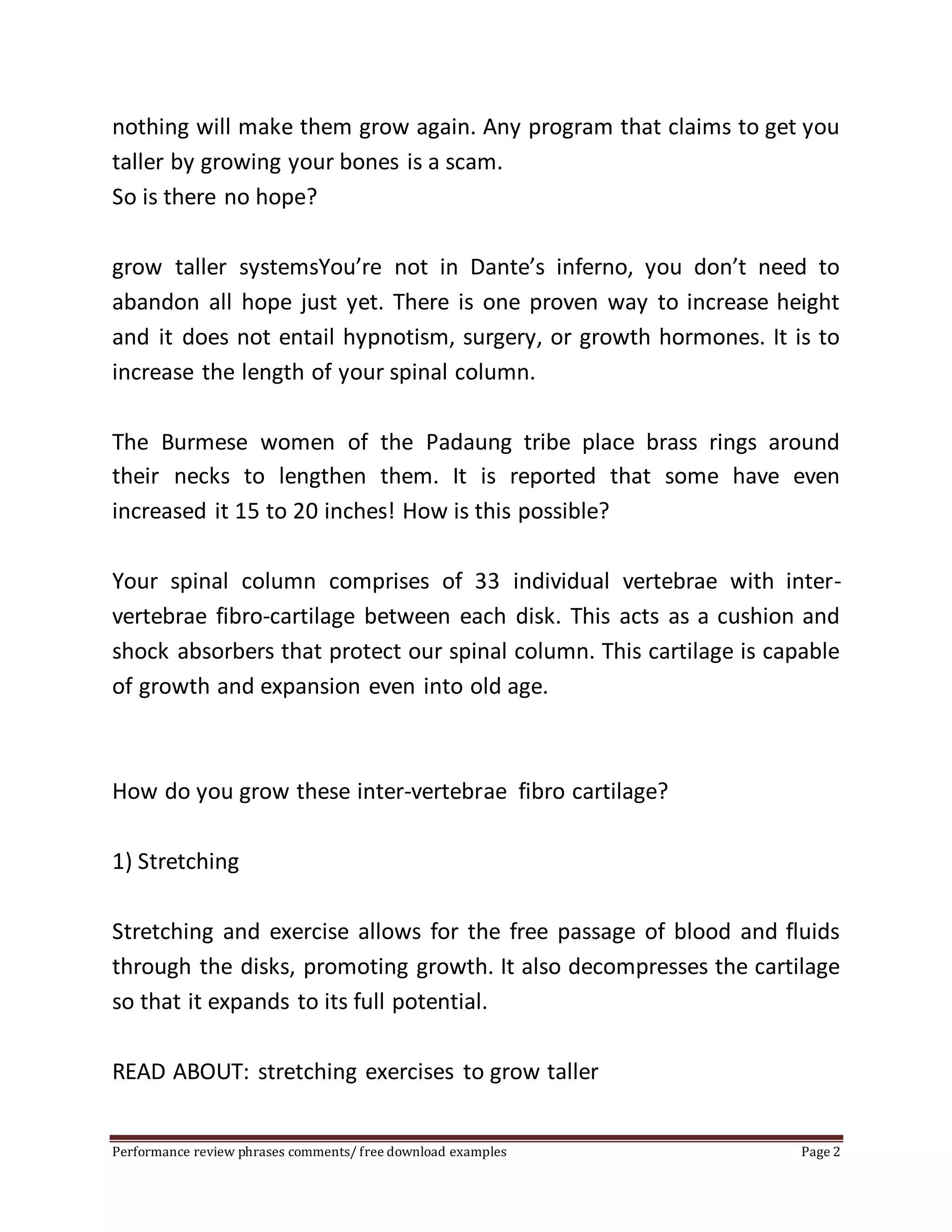 This document provides tips and information on how to potentially increase height through stretching exercises and improving spinal health. It explains that while genetics are the primary determinant of height, it may be possible to lengthen the spine and increase height by 1/2 to 2 inches through regular stretching, proper sleep posture, and following an exercise program. These natural methods can help maximize height potential without risky surgery.