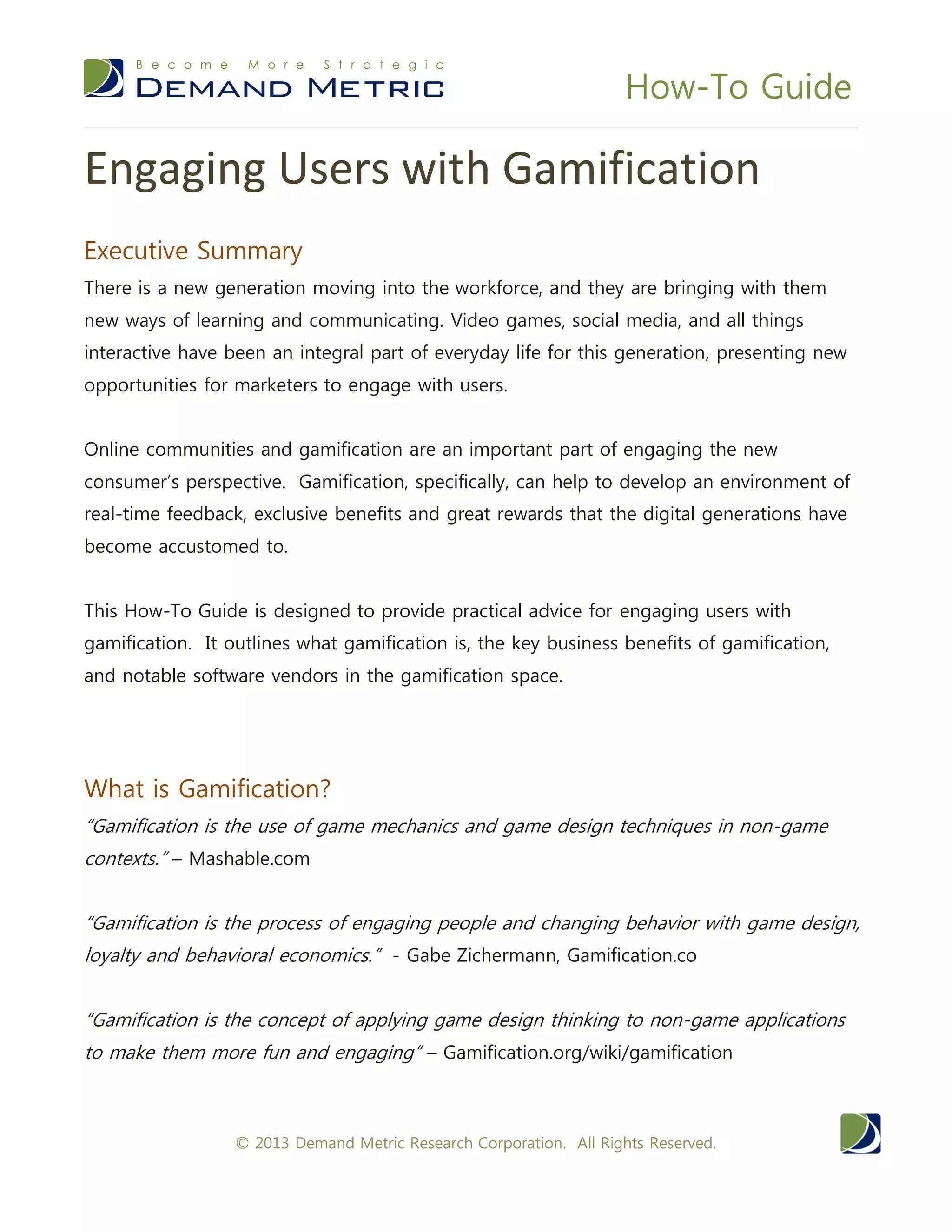 This document provides an overview of gamification and its benefits for engaging online communities. It defines gamification as using game mechanics and design to make non-game applications more fun and engaging. Key benefits of gamification include increased engagement, loyalty, user generated content, and revenue. The document also lists several gamification software vendors and provides an action plan for developing a gamification strategy.