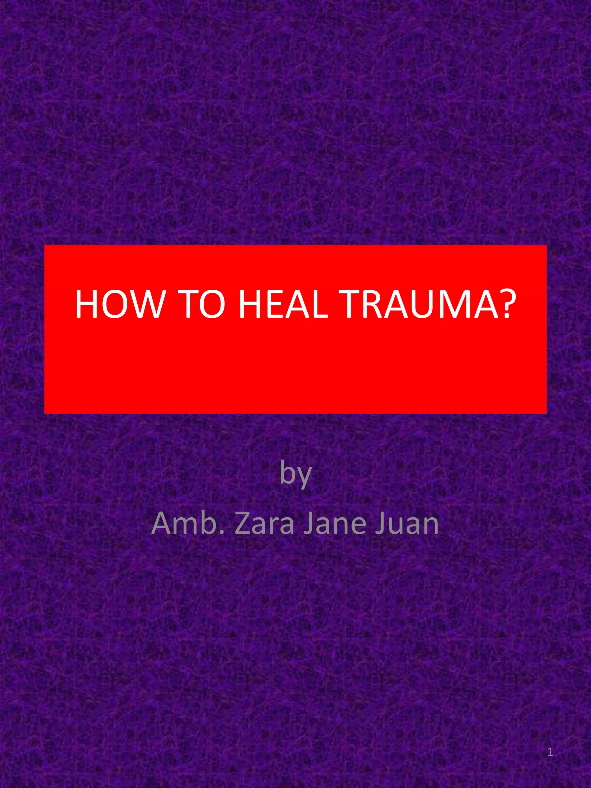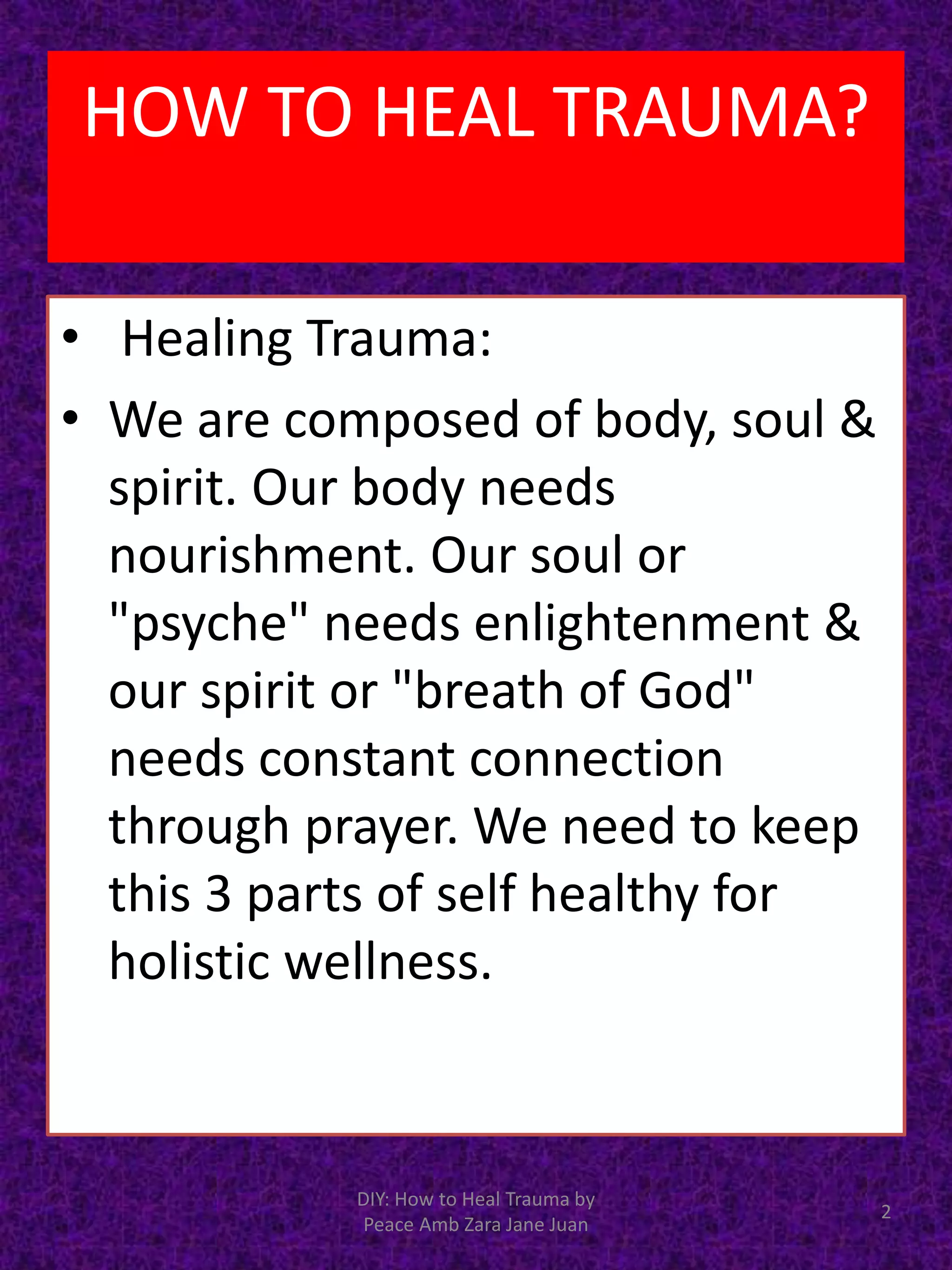 The document outlines methods for healing trauma, emphasizing the importance of addressing one's body, soul, and spirit for holistic wellness. It presents three healing approaches—extensive, moderate, and meditation—while stressing the importance of selecting a trustworthy healing companion and maintaining a pure heart throughout the process. The meditation technique is highlighted as a personal and solitary practice, recommending a structured schedule and a focus on self-nourishment during healing.