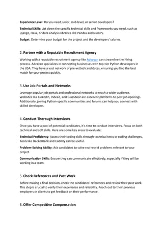 This guide outlines the process of hiring skilled Python developers in the USA, emphasizing the importance of clearly defining project requirements, leveraging recruitment agencies like Advayan, and utilizing job portals. It highlights the benefits of hiring locally, including access to a diverse talent pool and improved communication. Key steps include conducting thorough interviews, checking references, offering competitive compensation, and ensuring a smooth onboarding process.