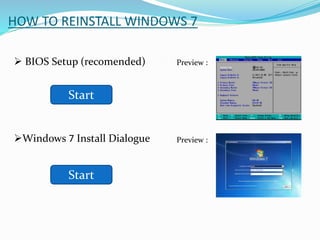 Dokumen ini menjelaskan langkah-langkah untuk menginstal ulang Windows 7 melalui pengaturan BIOS. Pengguna perlu mengatur booting dari CD-ROM dan mengikuti dialog instalasi hingga selesai, termasuk pembagian partisi dan pengaturan pengguna. Setelah instalasi, pengguna harus menginstall beberapa driver hardware untuk menyelesaikan proses.