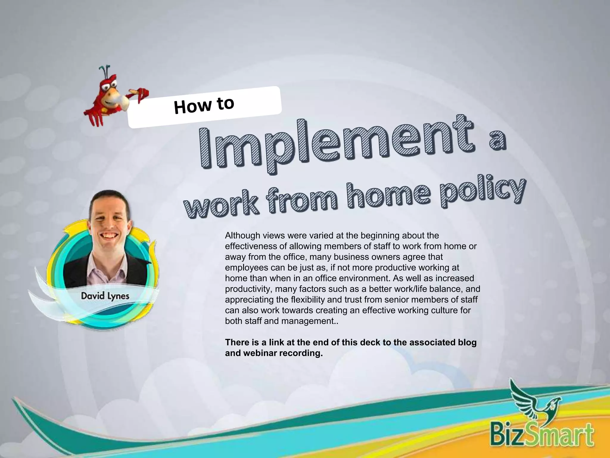 The document discusses considerations for implementing a work from home policy. It provides context that the number of homeworkers has risen significantly in recent years and is predicted to continue growing. It then outlines several key factors an employer should consider when creating a work from home policy, including who is suitable for remote work, equipment needs, health and safety, security, performance monitoring, employee motivations, and clearly wording the policy.