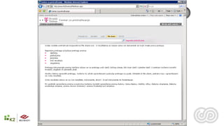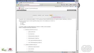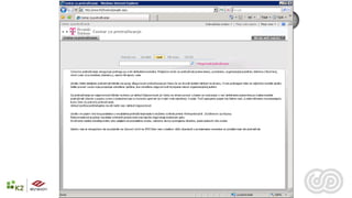 The document outlines the implementation of SharePoint in organizations, highlighting reasons for failures such as lack of clear purpose, inappropriate solutions, poor governance planning, and insufficient training. It provides strategies for successful implementation, including keeping it simple, starting small, and obtaining executive sponsorship while emphasizing the need for a governance plan. Additionally, various features and functionalities of SharePoint are discussed, showcasing its capabilities for collaboration, document management, and information search.