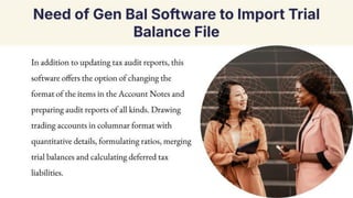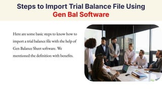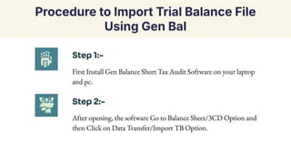 Learn how to easily import a trial balance file using Gen Balance Sheet software. This PDF provides step-by-step instructions in detail. First, install the Gen Balance Sheet tax audit software on your laptop or PC. Next, open the software and navigate to the Balance Sheet/3CD option. From there, click on the 'Data Transfer/Import TB' option. Finally, select the client for whom you want to import the Trial Balance.