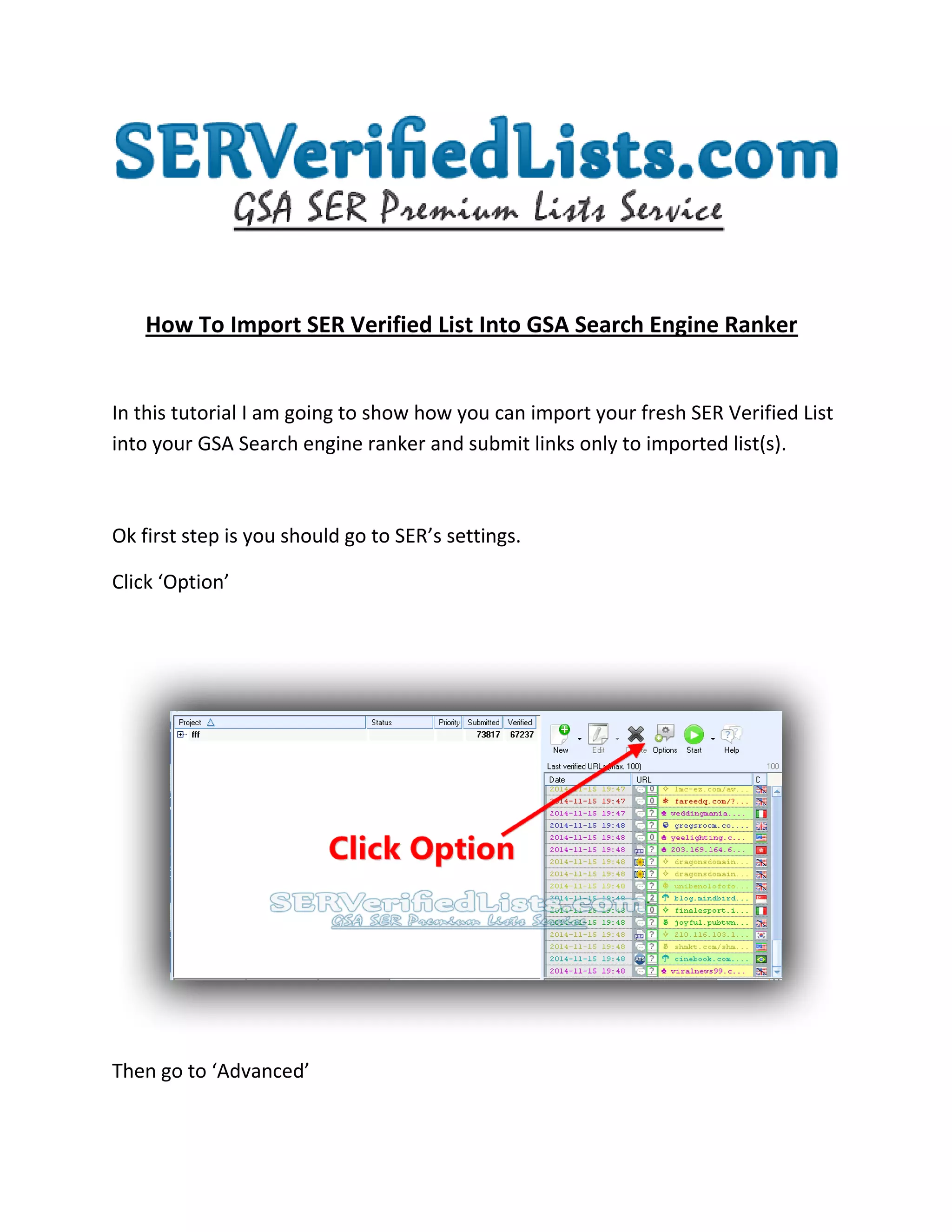 This document provides instructions for importing a SER verified list into GSA Search Engine Ranker and configuring projects to only submit links from the imported list. The key steps are: