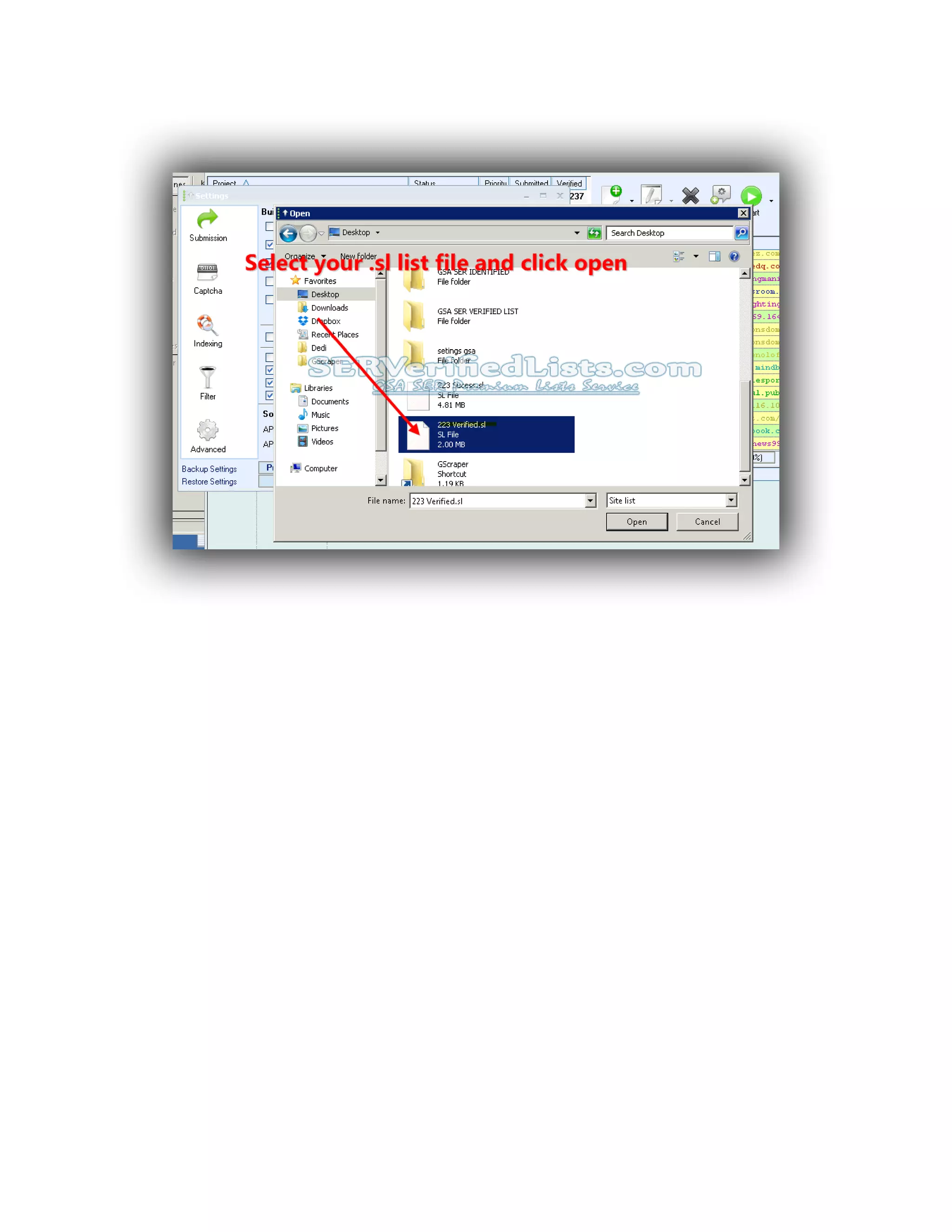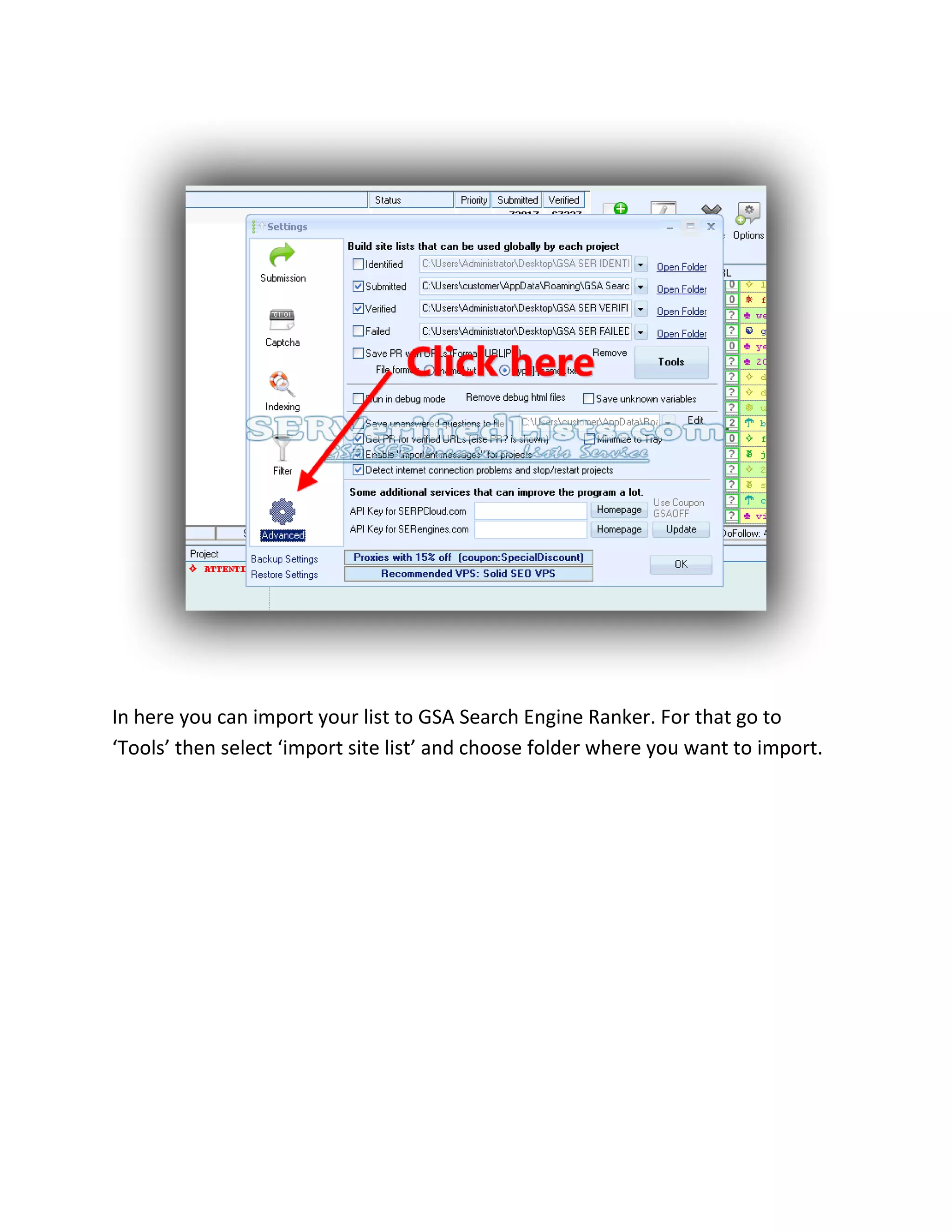 1) In SER, go to Settings > Advanced and select "import site list" to import the verified list zip file into a folder.