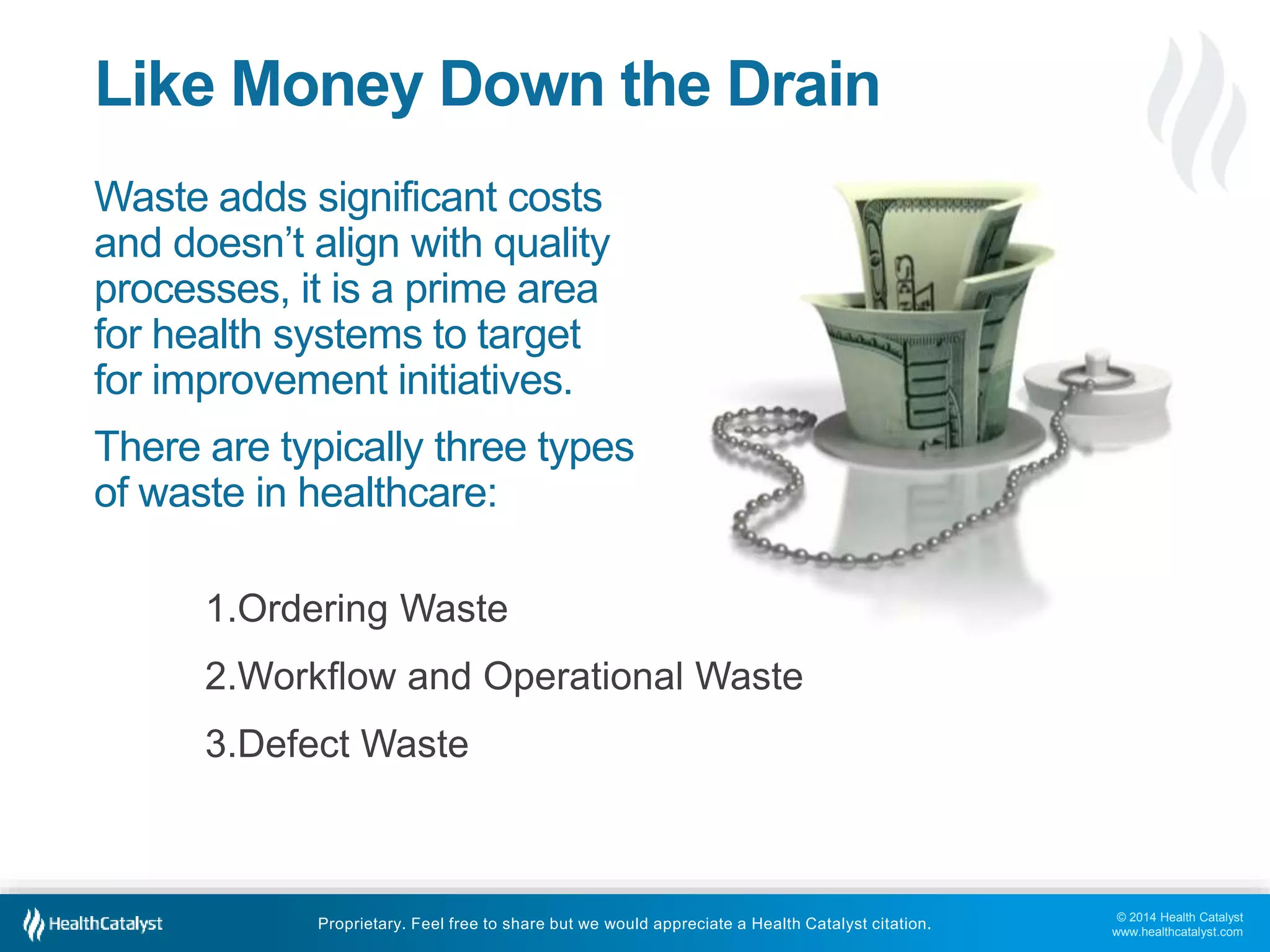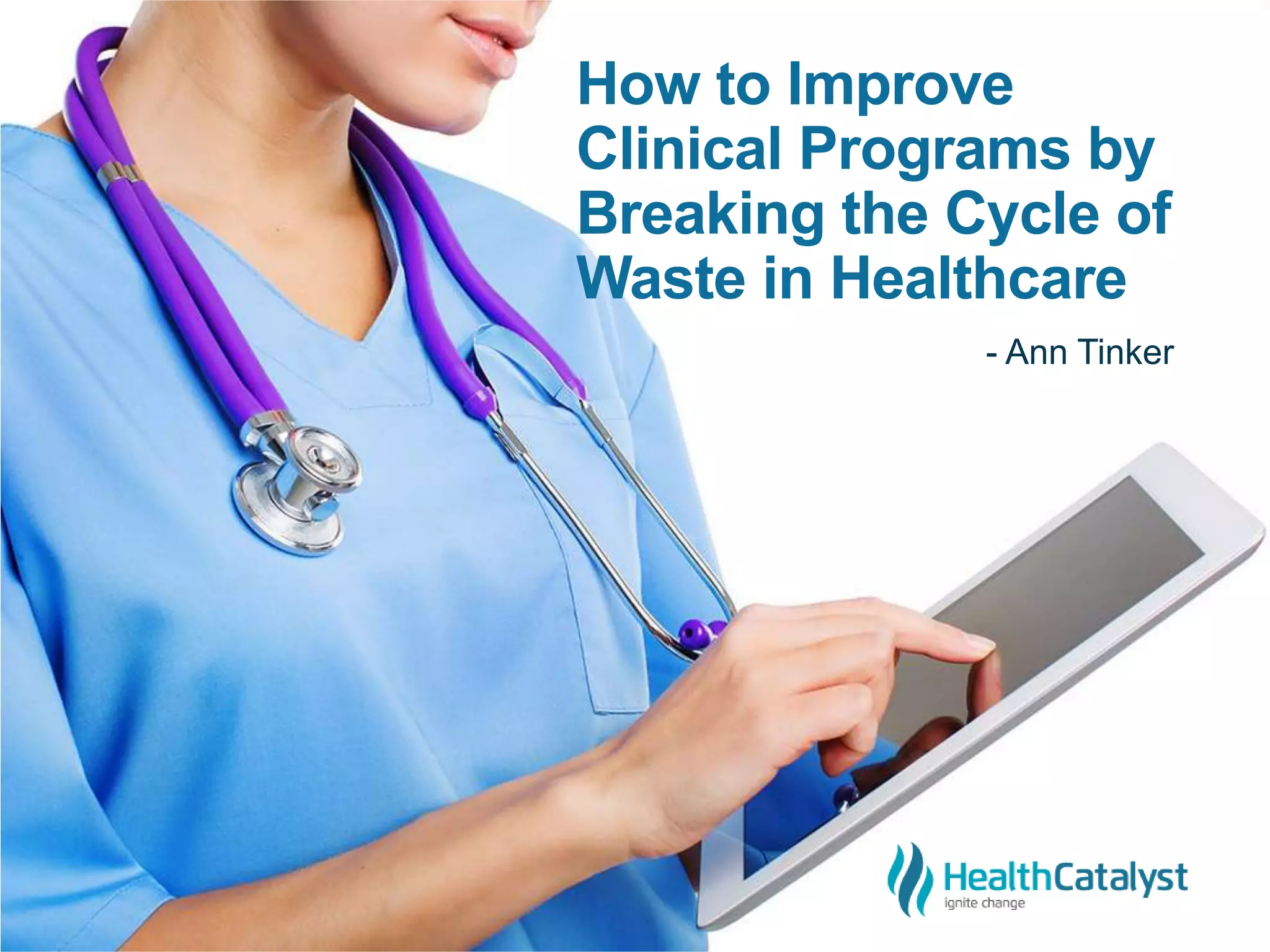 The document discusses methods to enhance clinical programs in healthcare by minimizing waste, which includes ordering waste, workflow and operational waste, and defect waste. It emphasizes the importance of data collection and enterprise data warehouses (EDWs) for identifying improvement opportunities, as well as the necessity of assessing organizational readiness for implementing changes. Tools like the Health Catalyst Key Process Analysis are highlighted as essential for integrating clinical and financial data to prioritize improvement projects effectively.