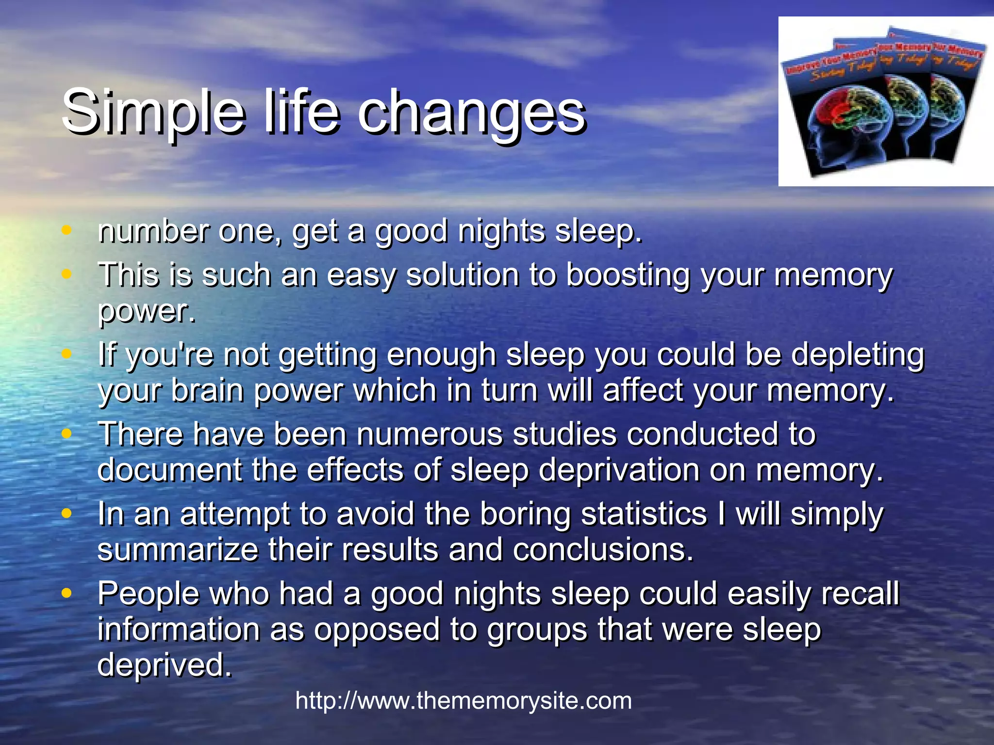 Getting enough sleep, exercising regularly, and starting a walking program are simple lifestyle changes that can improve memory according to the document. Sleep deprivation negatively impacts memory, while exercise strengthens the connection between the brain and muscles and leads to better awareness and memory through walking or other physical activity. The document recommends starting with a 3 day per week, 45 minute walking routine that can then be expanded with resistance training for more memory and health benefits.