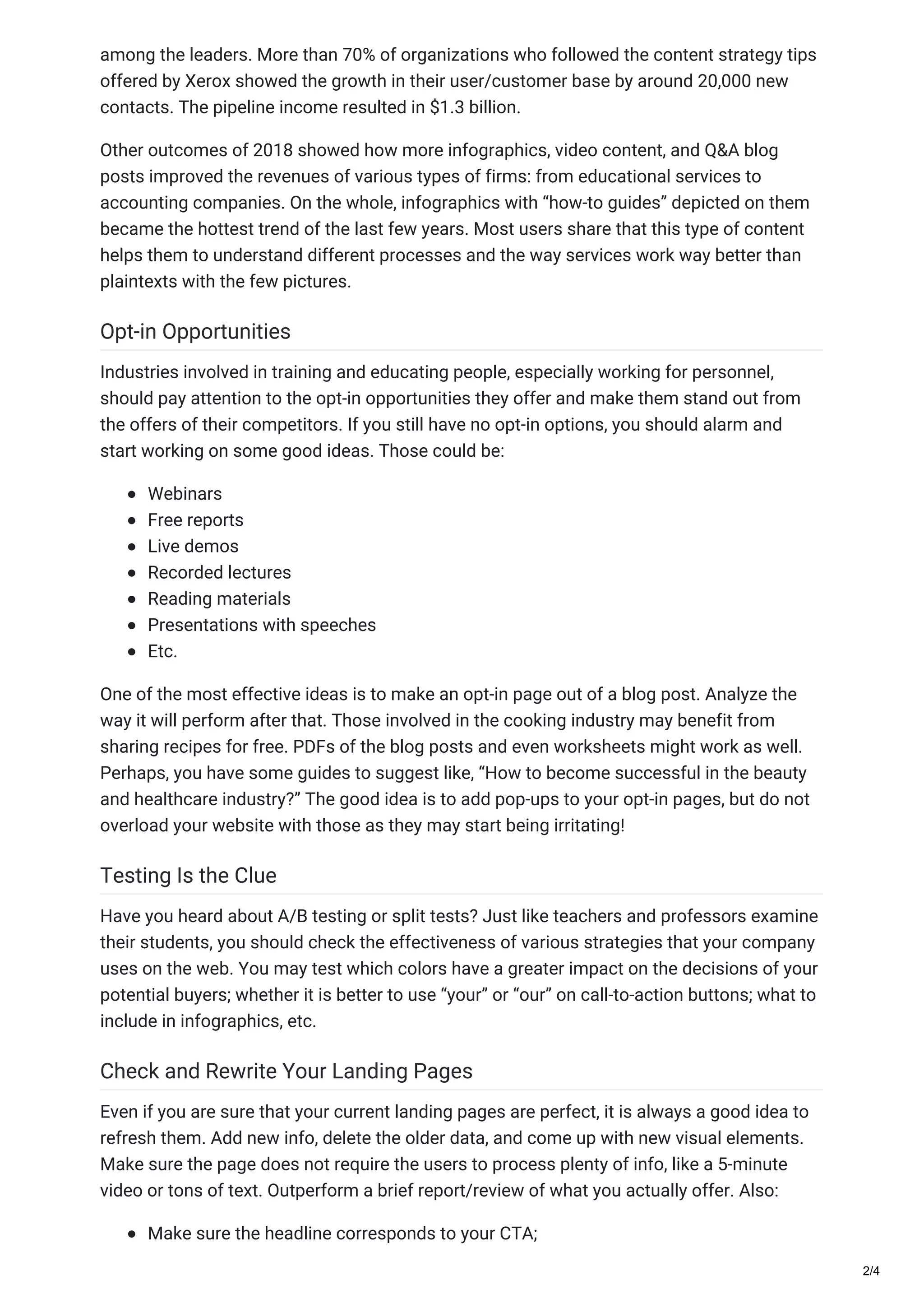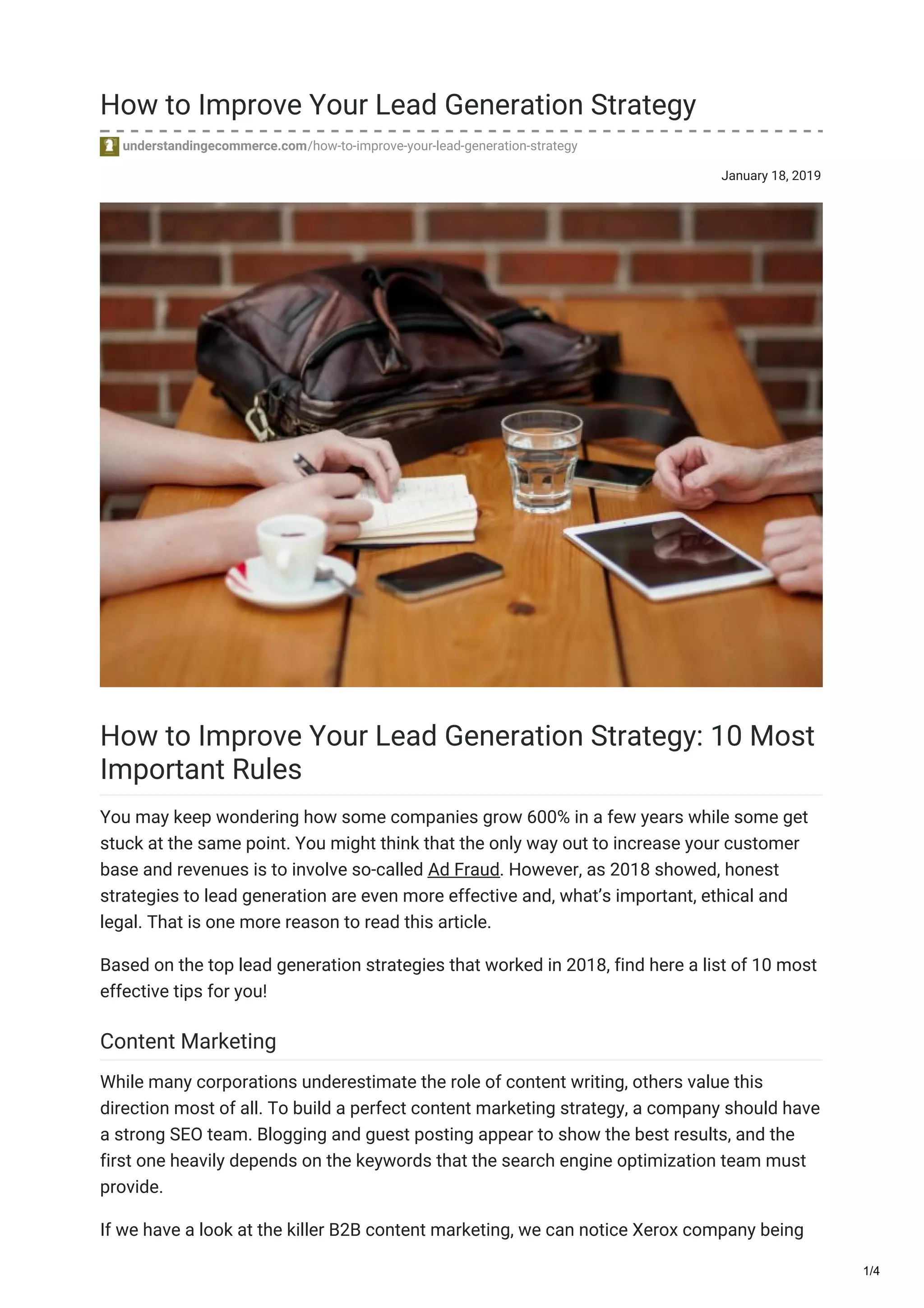 The document provides 10 tips for improving lead generation strategies based on effective strategies from 2018. These include focusing on content marketing like blogging and guest posting, optimizing opt-in opportunities through webinars and reports, testing strategies through A/B testing, refreshing landing pages, utilizing email marketing, keeping social media updated, improving distribution and promotion plans, making outstanding offers, joining networking events, and using success stories to connect personally. The key is focusing on useful, meaningful content that keeps users engaged.