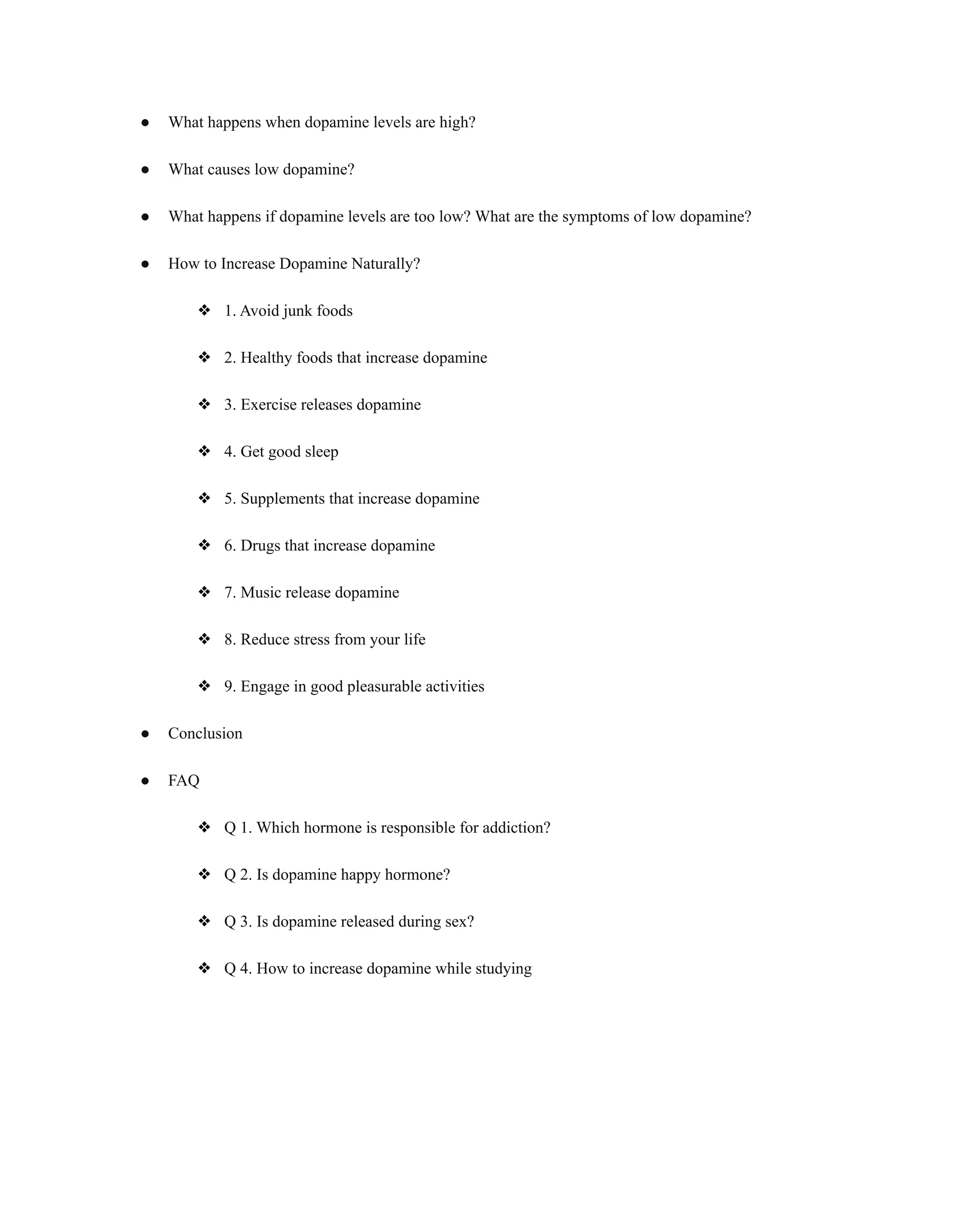 The document outlines effective methods to naturally boost dopamine levels, emphasizing the importance of dopamine for motivation, pleasure, and emotional regulation. Key strategies include avoiding junk food, engaging in regular exercise, consuming a diet rich in tyrosine, ensuring adequate sleep, and using specific supplements. It also discusses the risks associated with both high and low dopamine levels, highlighting the potential for addiction and various health issues.