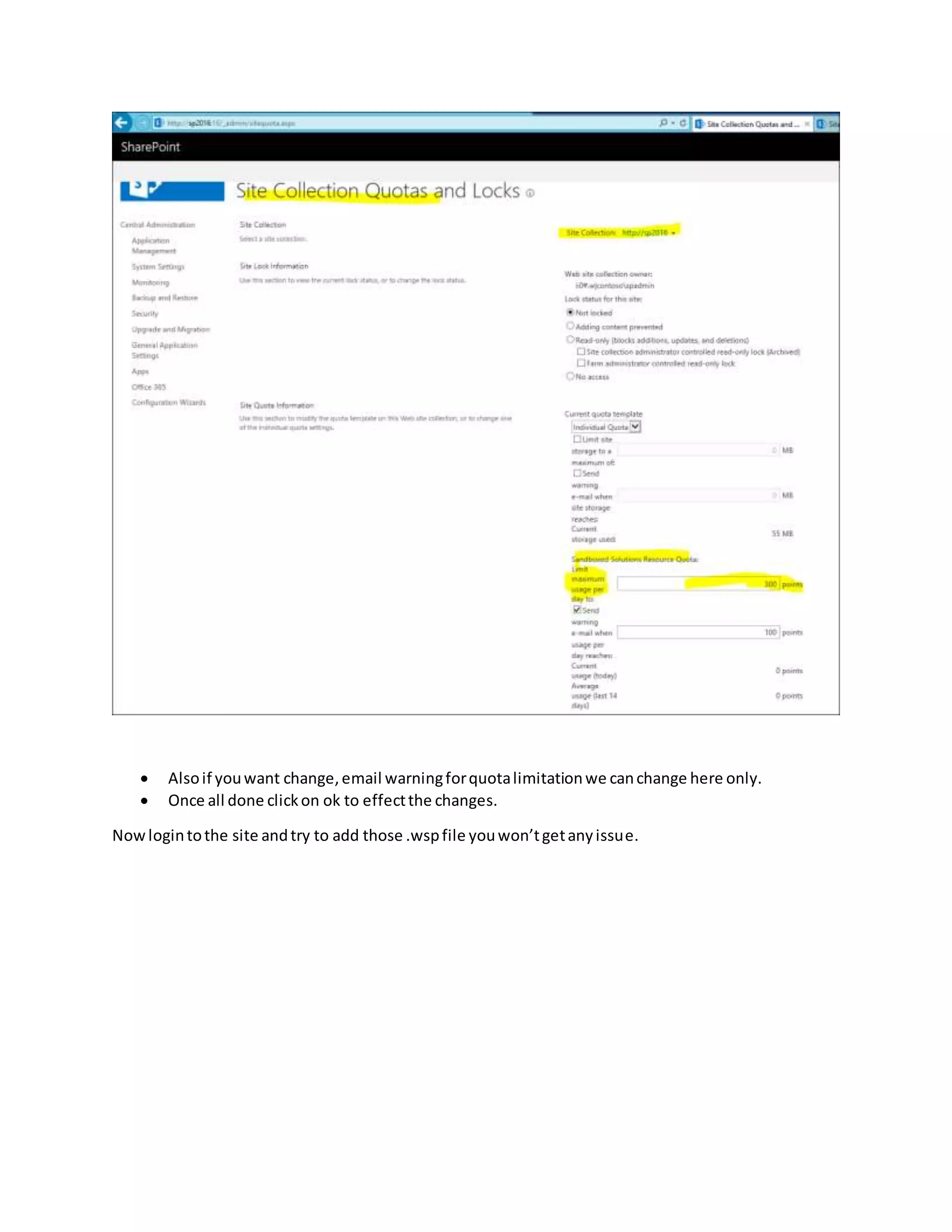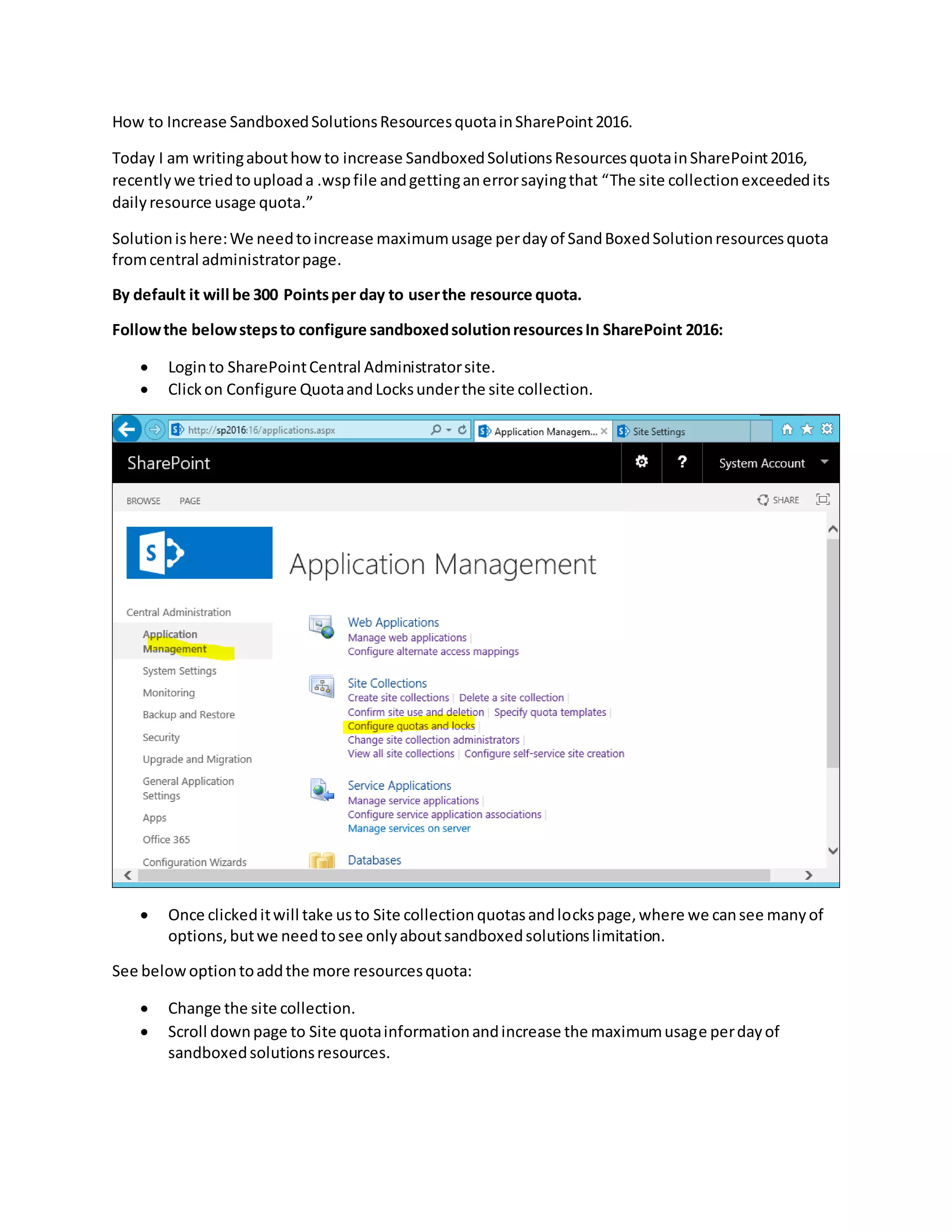 This document provides steps to increase the SandboxedSolutionsResourcesquota in SharePoint 2016. The default quota is 300 points per day, which can be exceeded when uploading certain files. To increase the quota: 1) Log into the SharePoint Central Administration site 2) Click "Configure Quota and Locks" and select the site collection 3) On the Site Collection Quotas and Locks page, increase the "Maximum usage per day of sandboxed solutions resources" value 4) Click OK to apply the changes and allow larger file uploads without exceeding the daily quota