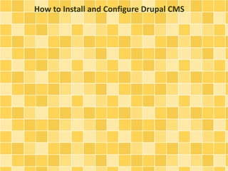 Drupal is a free and open-source content management system (CMS) that allows users to build and manage dynamic websites without needing knowledge of PHP. It requires PHP, MySQL, and cron jobs to function properly. To install Drupal, download and extract the files, set up the configuration file and database, and upload the files to a web server. Additional configuration includes setting permissions, enabling modules, customizing themes and menus, and modifying settings.