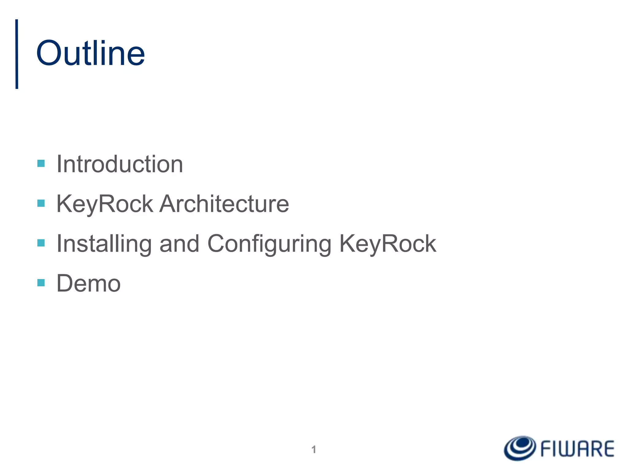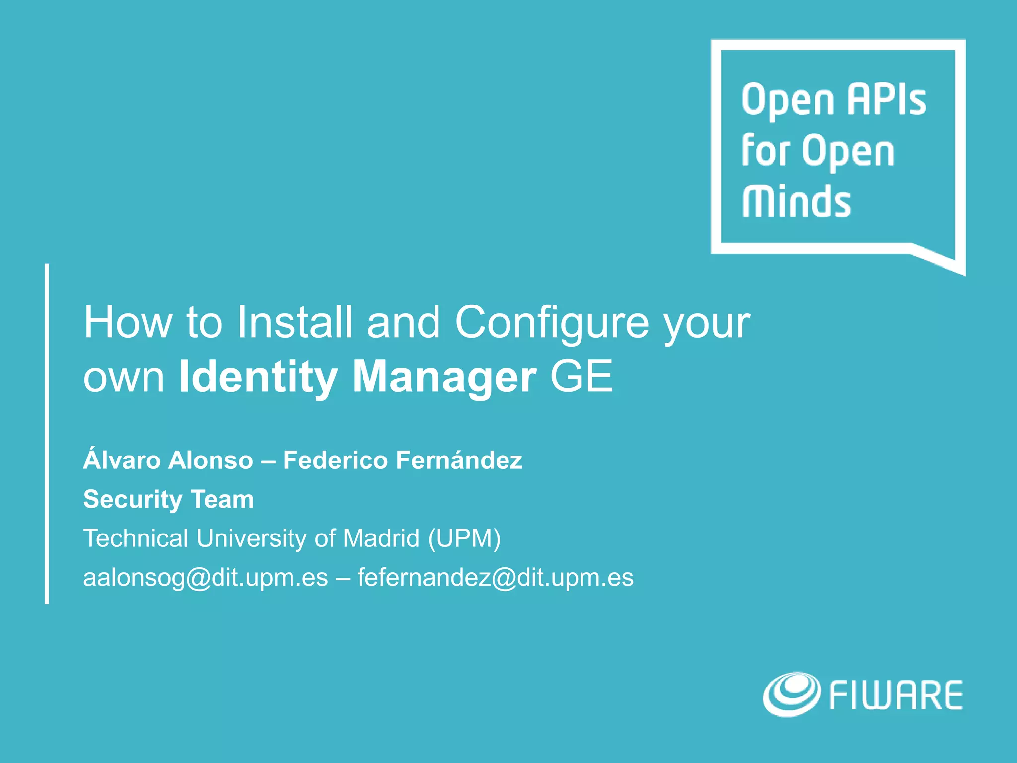 This document provides instructions on how to install and configure the FIWARE Identity Manager GE (KeyRock). It describes the KeyRock architecture which includes the Horizon front-end, Keystone back-end, and database. It then outlines the step-by-step process for installing both the front-end and back-end components, and how to configure KeyRock for development and production environments. The document also introduces the idm-admin tool for administrating a KeyRock instance.