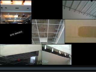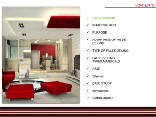 This document discusses different types of false ceilings, including their purposes, advantages, materials, and installation methods. It describes common suspended ceiling systems like exposed and concealed grid ceilings. Key materials mentioned include gypsum boards, metal panels, fiberboard, and mineral tiles. Installation photos show the process for concealed grid and exposed strip ceilings.