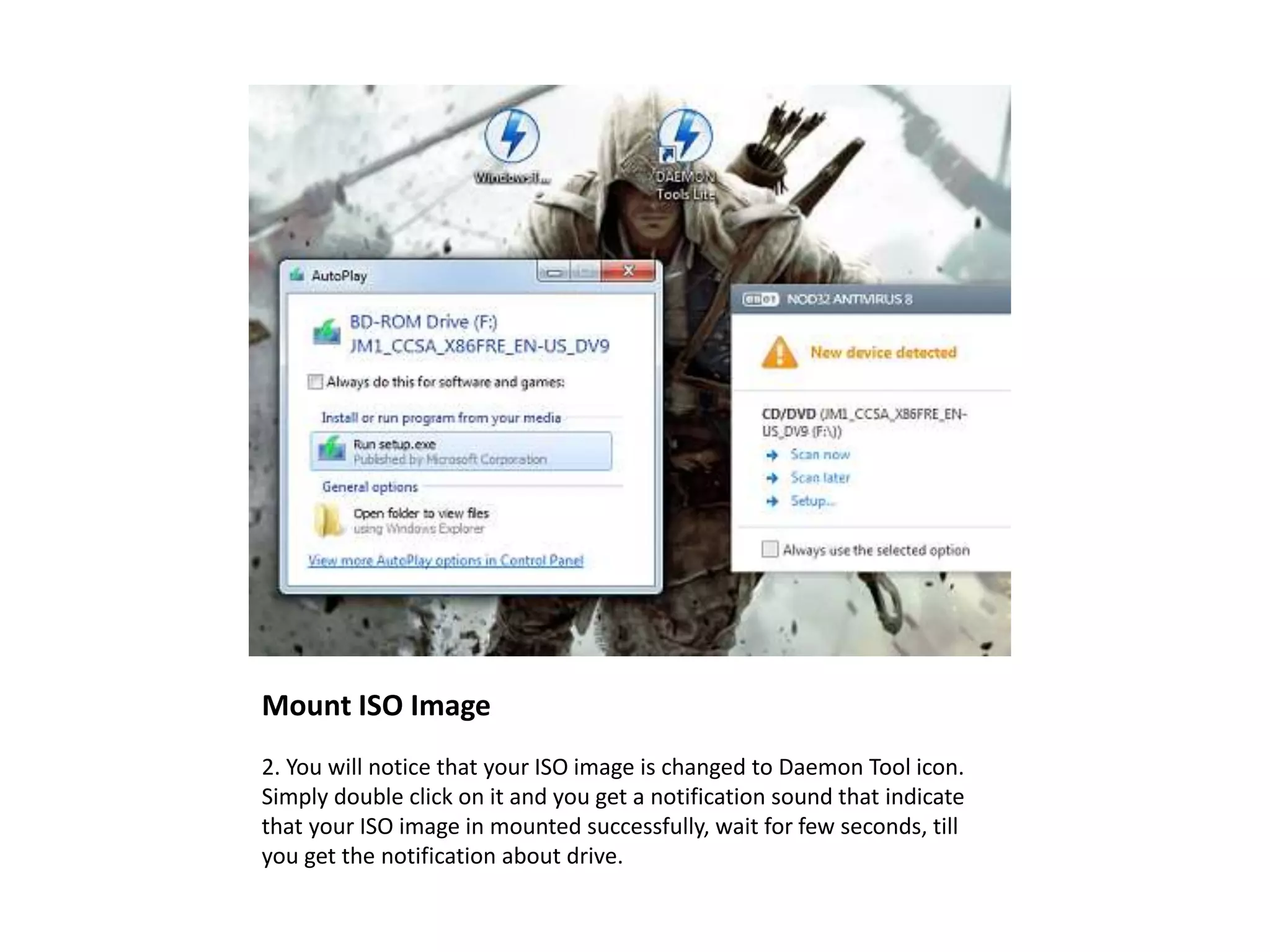This document provides a step-by-step guide for installing Windows 10 using Daemon Tool and an ISO image instead of a USB drive or DVD. It details the process of downloading necessary files, mounting the ISO image, running the setup as an administrator, and completing the installation. The instructions emphasize key steps and caution against auto-running setup files.
