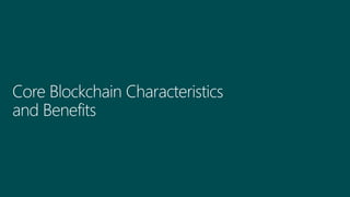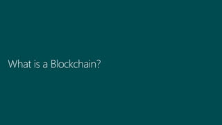 This document discusses how to integrate blockchain technology into applications. It begins by introducing the speaker and their background. It then provides an overview of different types of blockchain networks including public, private, and consortium networks. It discusses some popular blockchain platforms like Corda, Quorum, and Hyperledger Fabric. It outlines the basic components of how blockchain works including transactions, blocks, and nodes. The document discusses how blockchain can be used to streamline trust between parties in areas like supply chain management, financial transactions, and more. It notes that building blockchain applications from scratch is challenging. Microsoft provides tools and services to simplify blockchain development including managing networks, modeling smart contracts, and building applications. Examples are given of Starbucks and Singapore Airlines using blockchain
