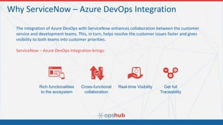 The integration of ServiceNow with Azure DevOps enhances collaboration between customer service and development teams, facilitating faster issue resolution and improved visibility of customer priorities. Utilizing Opshub Integration Manager, the integration ensures bi-directional synchronization of tickets and updates, allowing teams to automate status changes and maintain real-time context. This integration empowers enterprises to make quicker decisions, improve response times, and maintain traceability throughout the development lifecycle.