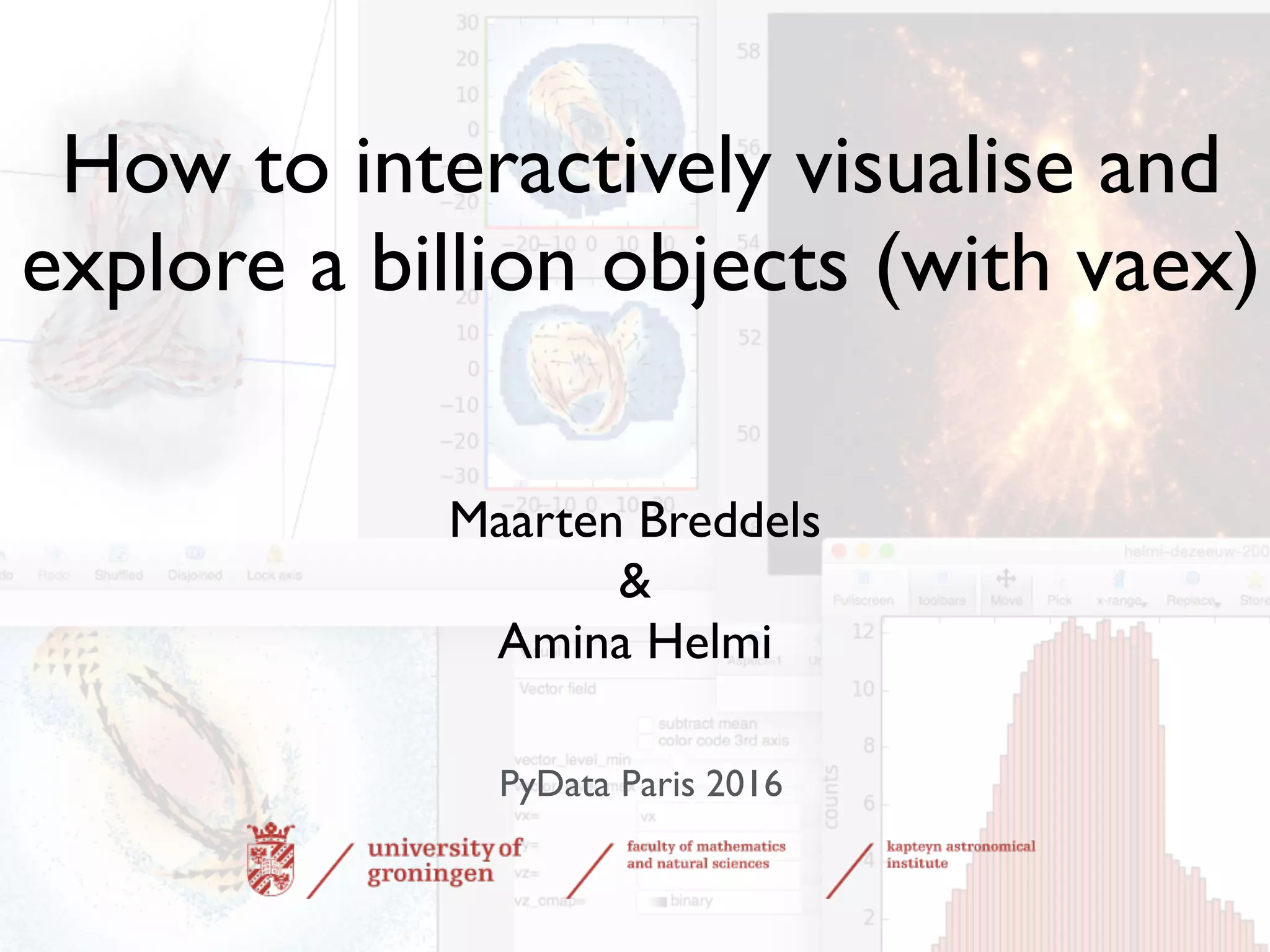 This document discusses visualizing and exploring large astronomical datasets, such as the upcoming Gaia catalog containing over 1 billion stars. It introduces Vaex, a Python library for interactively visualizing and exploring such large datasets. Vaex uses memory mapping to efficiently load large datasets into memory without copying, histograms to visualize distributions, and selections/queries to explore subsets of data. It provides fast interactive exploration of datasets containing billions of objects on a single computer. Examples of using Vaex to visualize simulations of the Milky Way halo are presented.