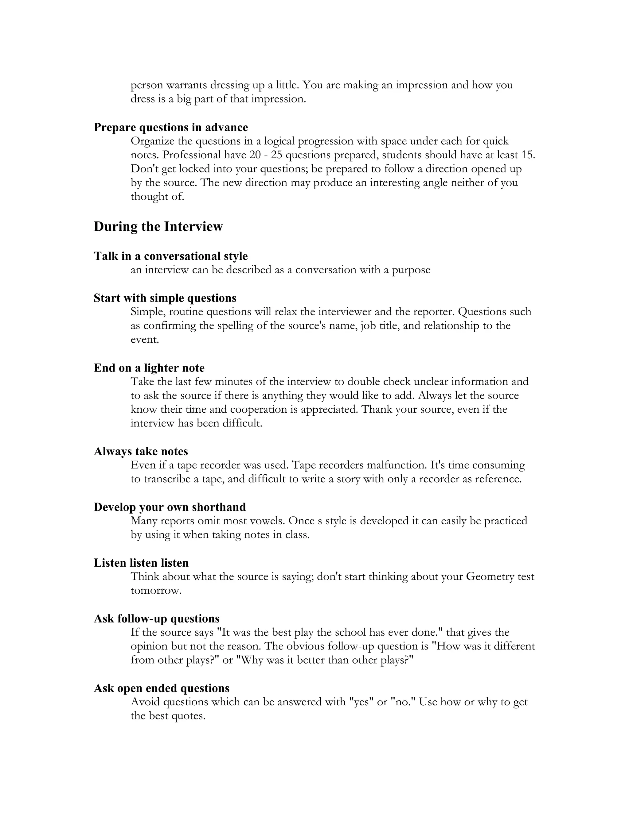 The document provides guidance for conducting effective interviews for news stories. It outlines important steps before, during, and after the interview. Key points include brainstorming interview subjects and questions in advance, conducting background research, dressing appropriately for the interview, taking thorough notes, asking follow-up questions, and beginning writing the story immediately after the interview. The overall goal is to relax interview subjects, get insightful quotes, confirm facts, and craft a compelling story for readers.
