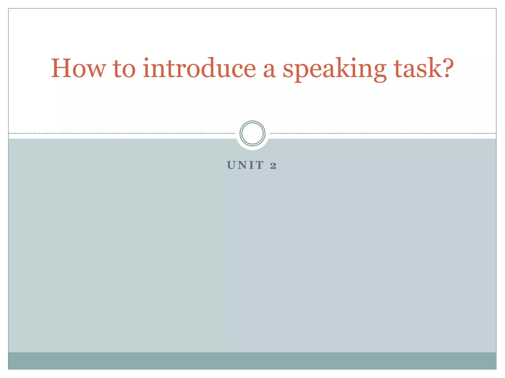This document provides guidance on how to introduce a speaking task. It recommends that introductions be solid, quick, and concise to make a good first impression. It advises determining the purpose of the task, which is usually to present an opinion, explain facts, summarize another's position, or describe something important. The introduction should state the topic or thesis and then state the reasons or facts to support it depending on the task. Introductions for opinions use phrases like "I believe" while those for summarizing others use phrases like "This person argues." The introduction is meant to be brief and to the point.