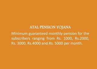 The document provides information about joining the Atal Pension Yojana (APY) pension plan in India. The APY offers minimum guaranteed monthly pensions ranging from Rs. 1000 to Rs. 5000. Indian citizens between 18 and 40 years old with a bank savings account can enroll. The process involves submitting an application at participating banks. Subscribers contribute through auto-debit from their bank account monthly, quarterly, or half-yearly until age 60. The government provides a 50% co-contribution of up to Rs. 1000 annually for eligible subscribers who join before 2015. Payouts are available after age 60 or in special circumstances, and the spouse can continue contributions if the subscriber passes away.
