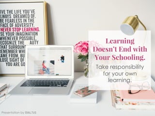 The document emphasizes the importance of continuous learning beyond formal education by taking proactive steps such as setting goals, scheduling learning time, and utilizing various resources like books and online courses. It encourages readers to seek new methods, observe others, ask questions, and take on challenges to improve skills. Additionally, it highlights the value of recognizing one's learning style and applying new knowledge in practical scenarios.