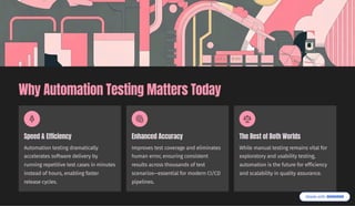 How to Learn Automation Testing: A Beginner-Friendly Roadmap" is a practical guide designed to help newcomers master automation testing step by step. It covers the fundamentals of software testing, essential tools like Selenium and Postman, scripting basics, framework design, and best practices. This roadmap provides a clear learning path—from understanding manual testing concepts to building and executing automated test cases—making it perfect for beginners aiming to start a career in QA automation.