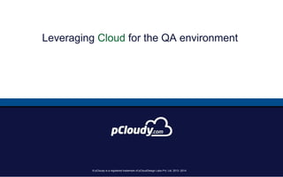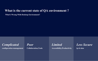 Leveraging the cloud for QA environments can address many of the issues with traditional desktop environments. The document outlines four key problems with desktop environments: 1) initial setup is complicated without configuration management or shared tools; 2) collaboration is poor without shared access or tools; 3) accessibility and productivity are limited without remote access; and 4) costs are high to purchase and manage devices. Moving QA to the cloud can solve these problems by providing 1) easy setup without software installations; 2) powerful collaboration tools; 3) anywhere accessibility; and 4) reduced costs through a shared, scalable environment. The cloud allows teams to focus more on testing and less on environment management.