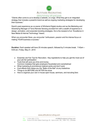 The document outlines strategies for leveraging job fairs as effective recruiting tools, emphasizing the importance of preparation, staffing, and follow-up processes. It includes detailed tips for engaging with job seekers, creating a welcoming booth atmosphere, and ensuring a streamlined follow-up after events. Additionally, it discusses internal and external hiring events, highlighting the significance of aligning company culture with recruitment efforts.