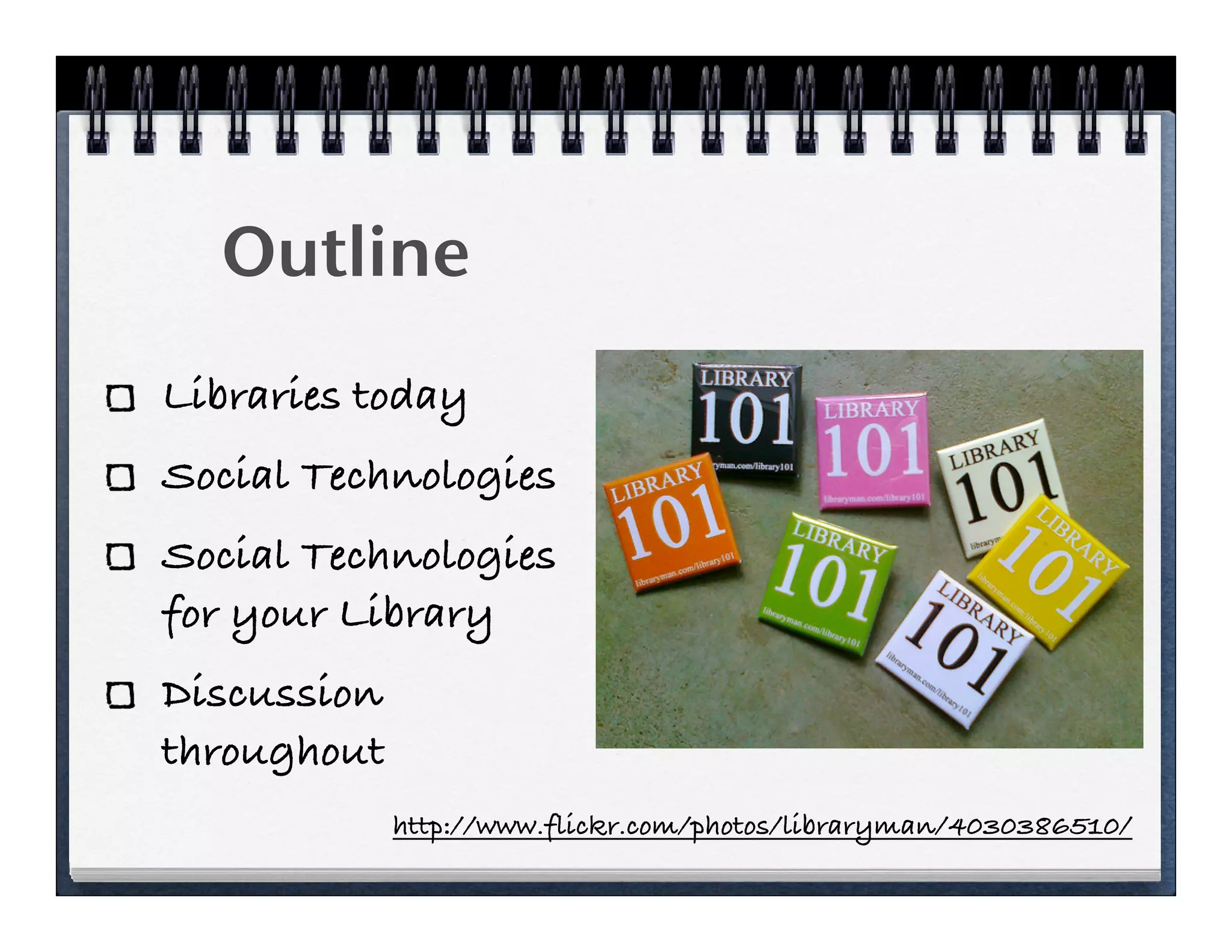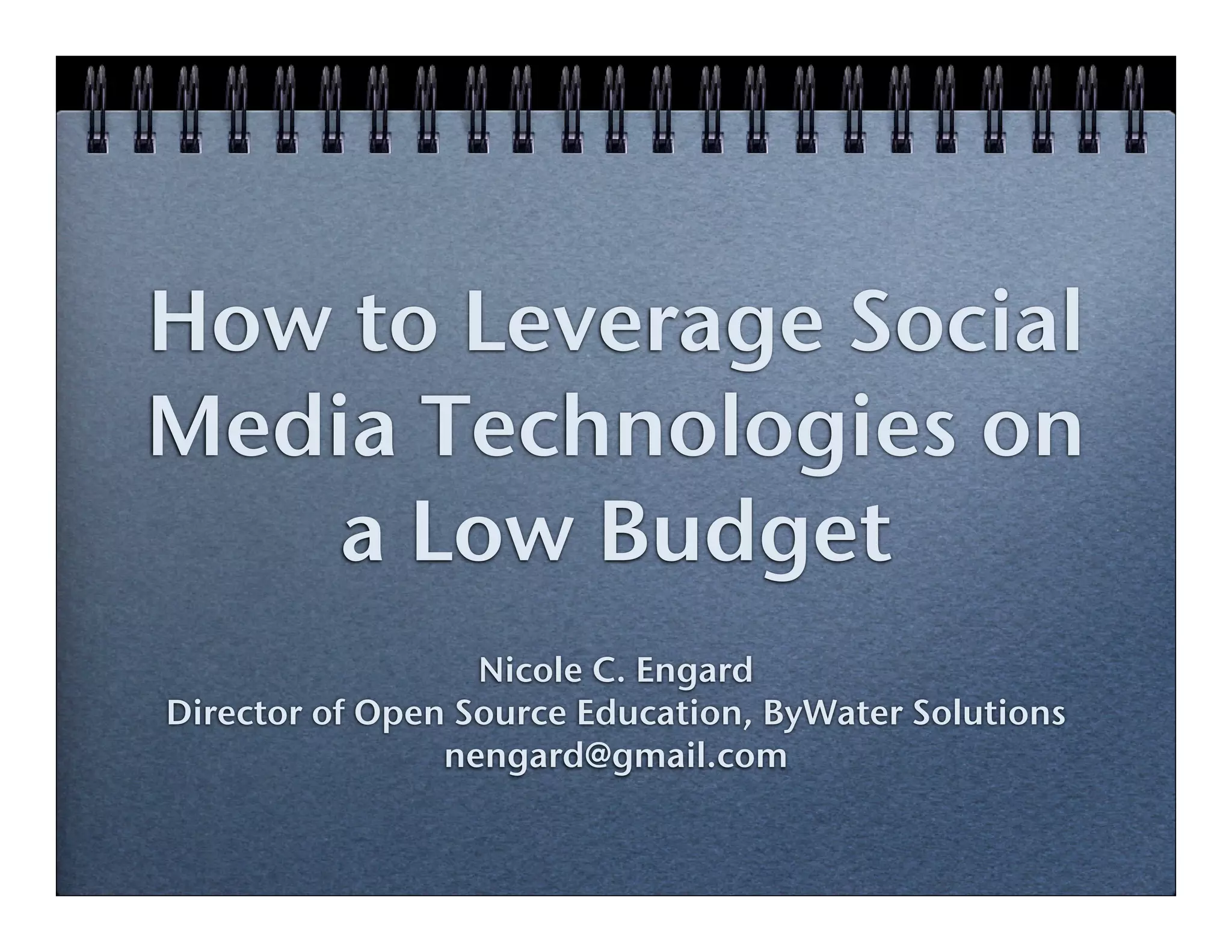 This document summarizes how libraries can leverage social media technologies on a low budget. It discusses how library budgets are declining but social tools provide opportunities to still provide services. It then provides overviews of many free social media tools for libraries to use, including blogs, file sharing, photo sharing, social networks, and office tools. It emphasizes that libraries should continuously learn about new tools by keeping up with colleagues and patrons.