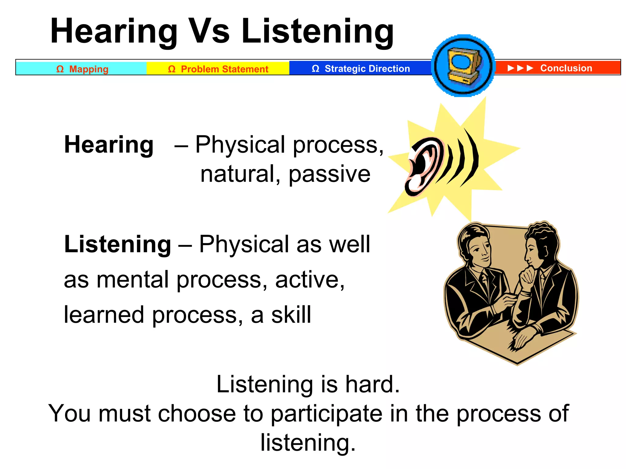 This document discusses listening skills, with a focus on active listening and empathic listening. It provides tips for being an effective listener, including establishing eye contact, taking notes, avoiding distractions, and following up to ensure understanding. Empathic listening is defined as listening with the intent to understand how the speaker feels in addition to their ideas. It suggests showing empathy by identifying with their emotions and situation, without judgment. The steps for empathic listening are to carefully listen to verbal and nonverbal cues, display an open posture, consider their emotional state, and calmly reflect back the speaker's feelings and meaning.
