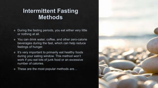 The document outlines various intermittent fasting methods, including the 5:2 diet, Eat Stop Eat, and the 16/8 method. The 5:2 diet involves eating normally for 5 days and restricting calories to 500-600 on 2 days, while Eat Stop Eat consists of a 24-hour fast once or twice a week, and the 16/8 method entails fasting for 14-16 hours each day with an 8-10 hour eating window. The 16/8 method is noted as being the most popular and sustainable approach.