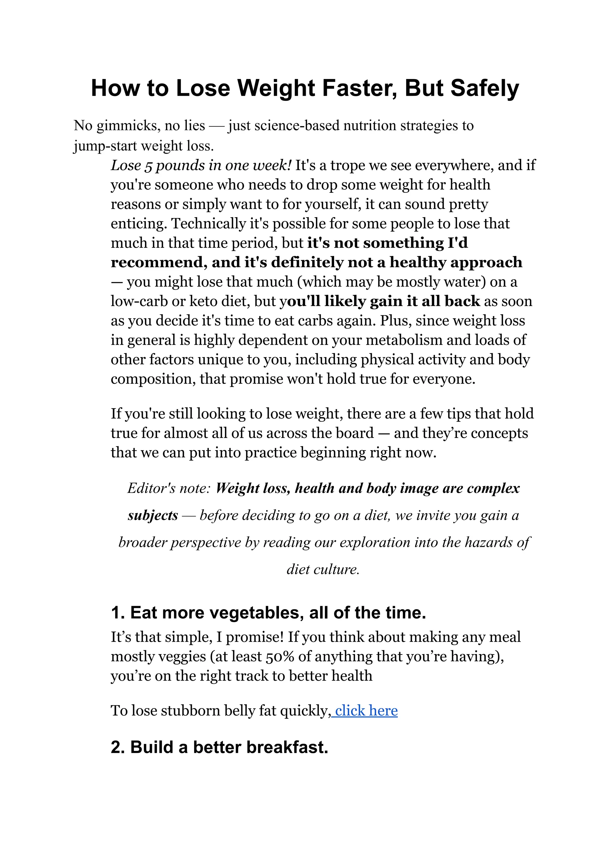 The document outlines science-based nutrition strategies for safe weight loss, emphasizing the importance of sustainable habits rather than quick fixes. Key recommendations include increasing vegetable intake, building a healthy breakfast, eating mindfully, and incorporating strength training. Additionally, it advises against skipping meals and consuming sugary beverages while promoting hydration and moderation for overall wellness.