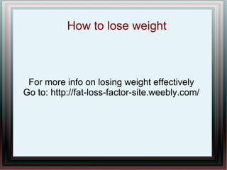 This document provides tips for effective weight loss, including modifying eating habits, being active in daily life, not focusing too much on the scale, and being consistent. The key factors for weight loss are making slow changes to diet by eating healthier foods and avoiding junk food. Regular exercise is also important, beginning slowly and gradually increasing intensity and duration. Sticking with lifestyle changes in diet and exercise over the long-term is essential to achieving results.