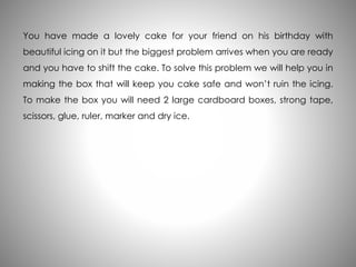 This document provides step-by-step instructions for creating a cake delivery box to safely transport a cake without damaging its icing. Essential materials include cardboard boxes, tape, scissors, and dry ice for cooling. The process involves sealing boxes, cutting sections, and securing the cake with tape and dry ice.