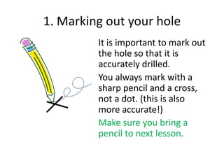 This document provides instructions for making a dowel joint in 5 steps: 1) Marking holes with a pencil cross, 2) Drilling holes safely using a pillar drill, hair tie, and protective gear. 3) Cutting dowels with a tenon saw and bench hook. 4) Gluing dowels into holes with PVA glue and wiping excess. 5) Letting the joint set for 6 hours with optional tape support.