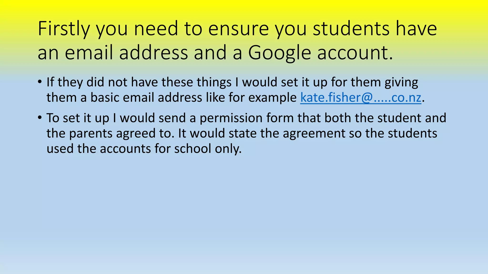 This document provides instructions for teaching students how to create Google Docs. It outlines 8 steps for making a Google Doc, including signing into a Google account, clicking Drive, double clicking Create, selecting Document, saving the document, and sharing options. It emphasizes the importance of digital security and citizenship when sharing documents, such as only sharing with trusted individuals and avoiding public sharing. The document also includes suggestions for beginning a class on Google Docs, such as a demonstration, supervised practice, and discussing appropriate sharing of work.