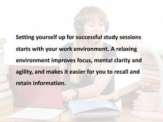 Creating a healthy study environment is essential for effective studying, which includes decluttering, ensuring good lighting, personalizing the space, and ramping up comfort. A clean and organized space enhances focus and reduces distractions, while lighting should be natural and comfortable to promote clarity. Personal touches and comfortable seating further contribute to a conducive study atmosphere.