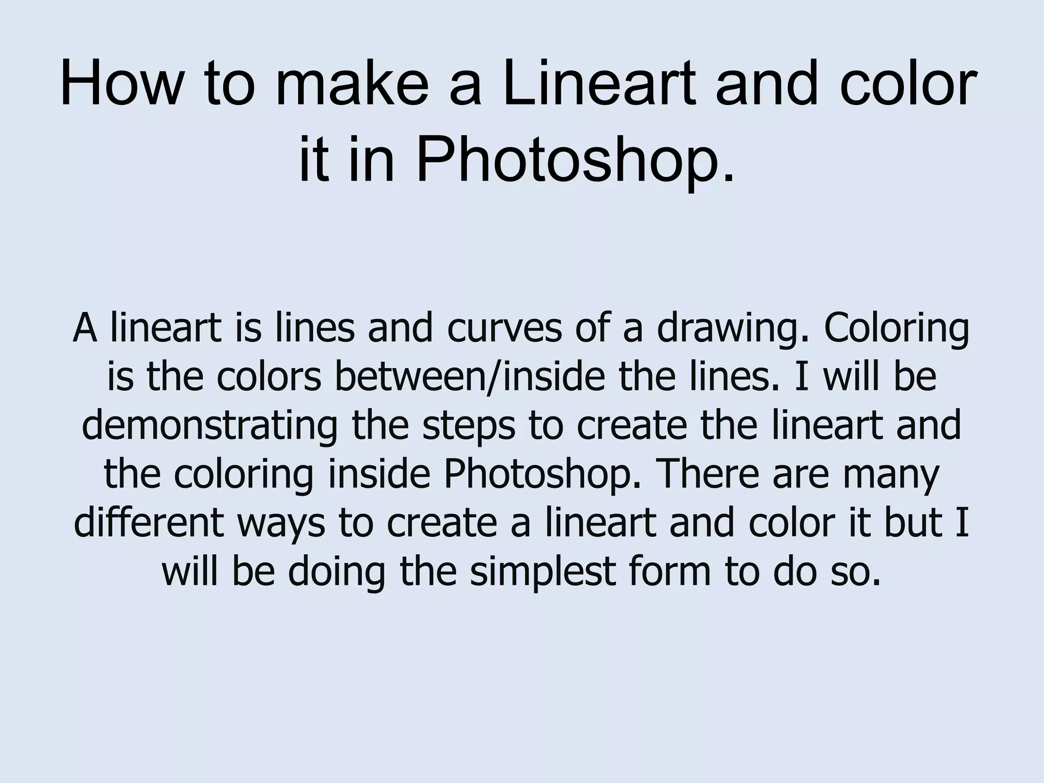 This document provides instructions for creating a lineart and coloring it in Photoshop. It outlines the main steps as making the lineart, coloring the lineart, and adding a background. For making the lineart, it describes selecting the lines, inverting the selection, and filling layers with black and white. For coloring, it explains creating clipping mask layers for different colors like skin, hair, and eyes and using tools like the smudge and dodge tools to blend colors. Finally, it notes that a background color can be filled or a gradient used.