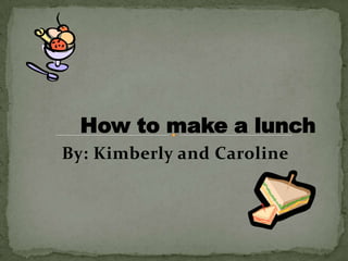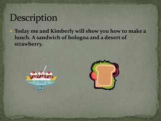 Two girls, Kimberly and Caroline, provide instructions for making a bologna sandwich and strawberry dessert for lunch. The sandwich recipe calls for bread, mayonnaise, bologna, cheese, and a plate. The dessert recipe includes strawberries, sugar, whipped cream, and a cherry topped with whipped cream and served in a small bowl.