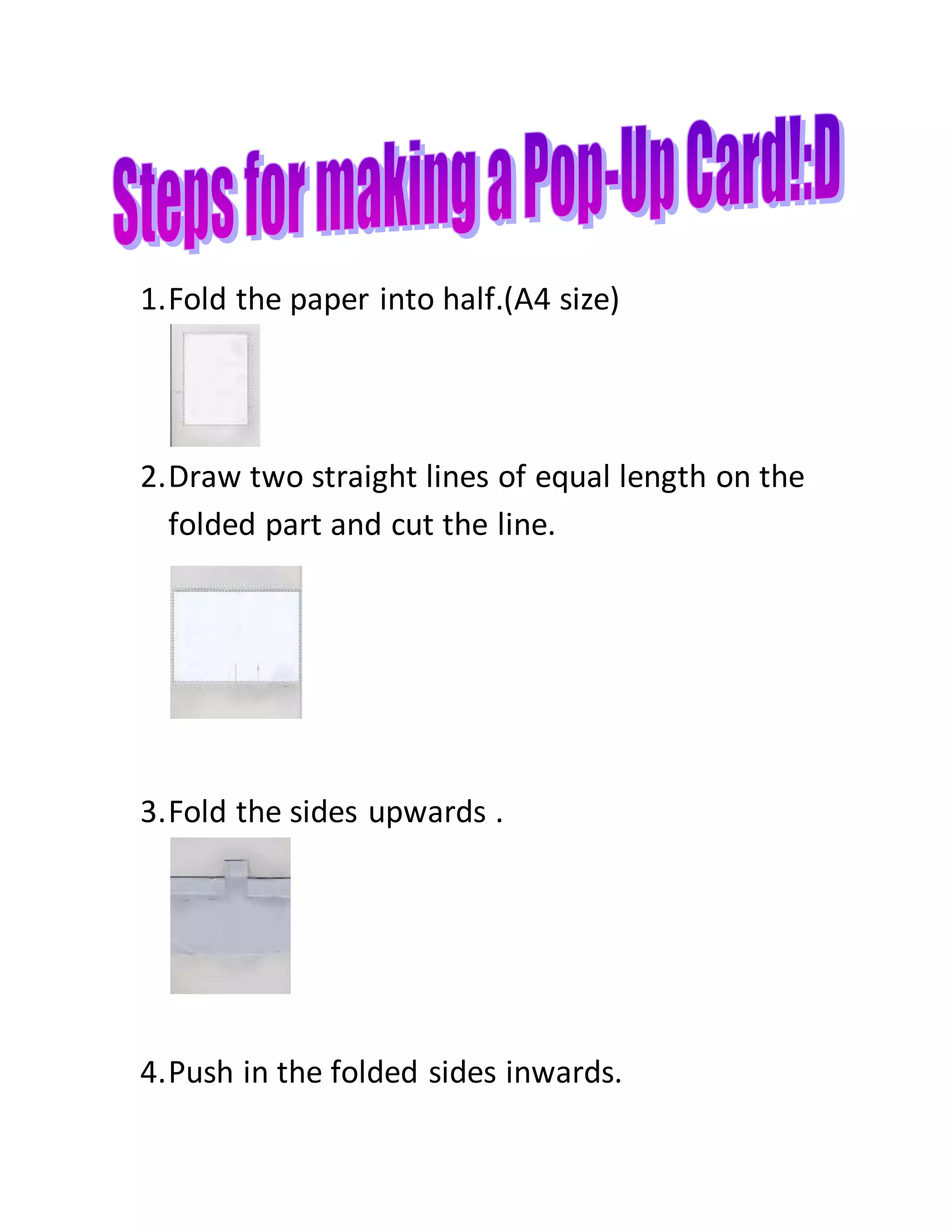 Fold an A4 sheet of paper in half and cut along two equal lines on the folded edge to create a basic card, then fold the sides upwards and push them inwards to form more steps. Additional steps can be added before decorating the finished card.