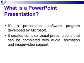 A PowerPoint presentation is a digital slide presentation created in Microsoft PowerPoint. It allows presenters to display information such as text, images, videos and audio to engage an audience. The purpose of a PowerPoint presentation is to present information to an audience in a concise visual manner that facilitates comprehension and faster decision making. Effective PowerPoint presentations use visual elements like images and minimal text over sentences and paragraphs to make the message memorable. Presenters should follow design best practices such as limiting each slide to 6 topics, using consistent fonts and colors, and only including images that complement the message rather than for decoration.