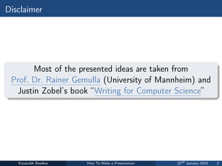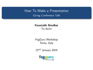 The document is a presentation guide by Kaustubh Beedkar on delivering effective conference talks, emphasizing the importance of engaging the audience rather than overwhelming them with details. Key points include preparation, delivery techniques, and the significance of simplicity and practice. It also outlines the structure of a good talk, including the use of visuals, clear messaging, and handling audience questions.