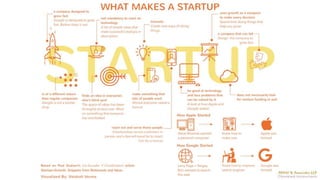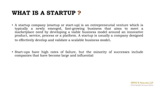 The document discusses the concept and definition of startups, highlighting their entrepreneurial nature, challenges, and the principles of creating a viable business model. It includes examples of successful startups in India, their founders, and their impact on various industries, alongside critical elements like funding and innovation. Additionally, it outlines the typical operational issues faced by startups and offers insights on startup-related jargons.